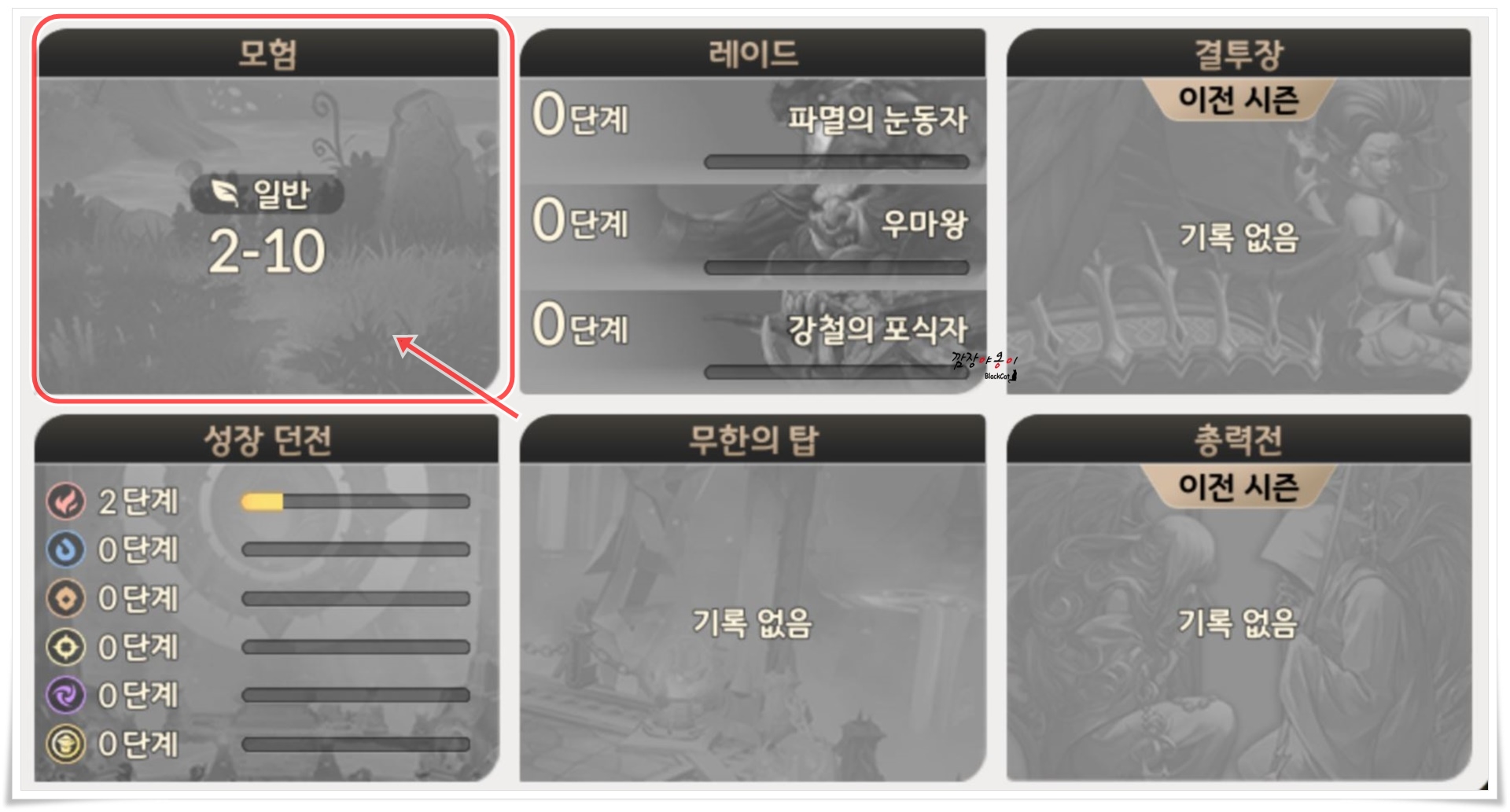 왼쪽 상단에 있는 캐릭터를 클릭하시면 여러분의 정보를 확인 할 수 있습니다. 여러분은 현재 모험이 어떻게 표시되어 있나요?