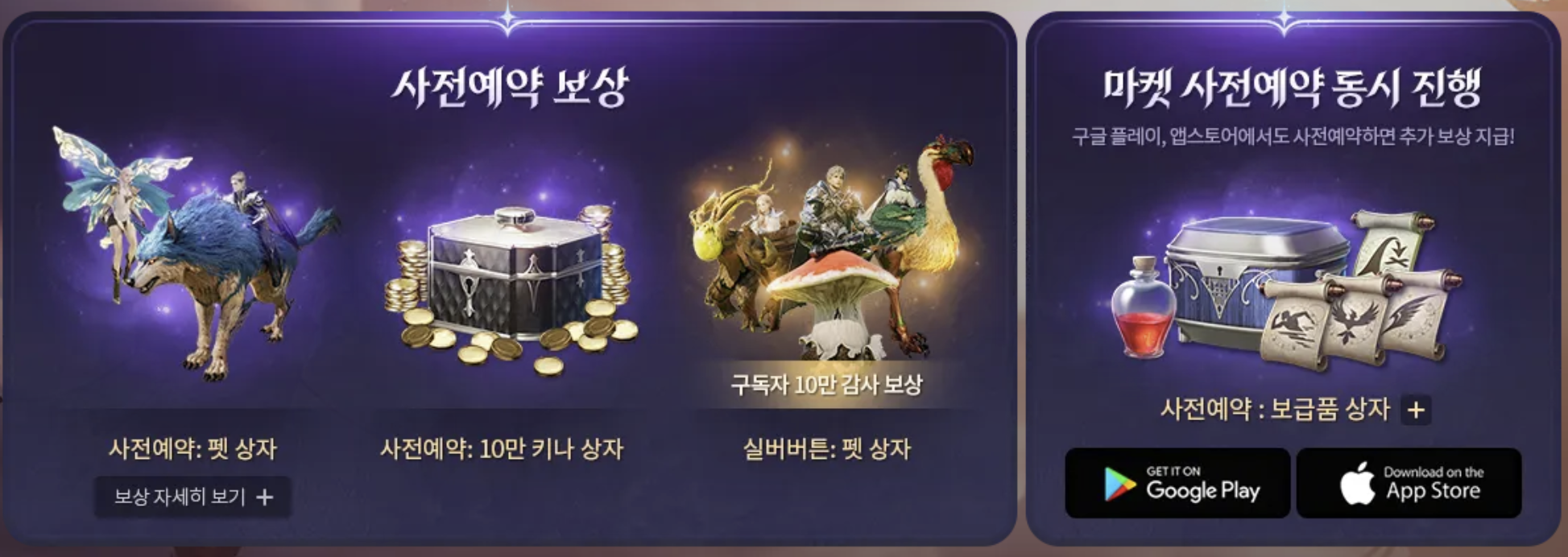 홈페이지에서 진행하는 사전 예약 뿐 아니라 구글 스토어/ 앱스토어에서 동시에 진행하는 사전예약까지 중복으로 하셔야 모든 아이템을 획득 하실 수 있습니다.
