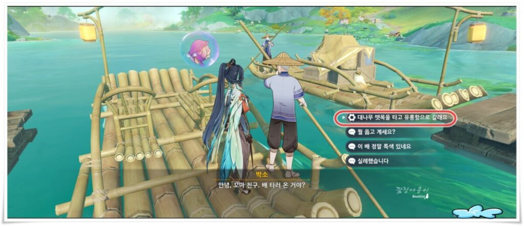 NPC박소와 대화를 진행하면 4가지 중 한가지를 선택할 수 있는데 첫번째 목록인 '대나무 뗏목을 타고 유릉항으로 갈래요'를 선택해 줍니다.
