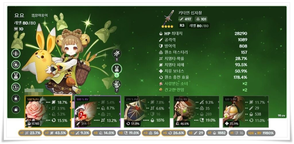 현재 제가 사용중인 요요의 성유물과 능력치입니다. 전 남는 성유물을 이용해 2+2로 사용중이며 원소폭발(Q) 사용시 힐량이 부족하진 않네요. 어차피 귀요미 담당이라...