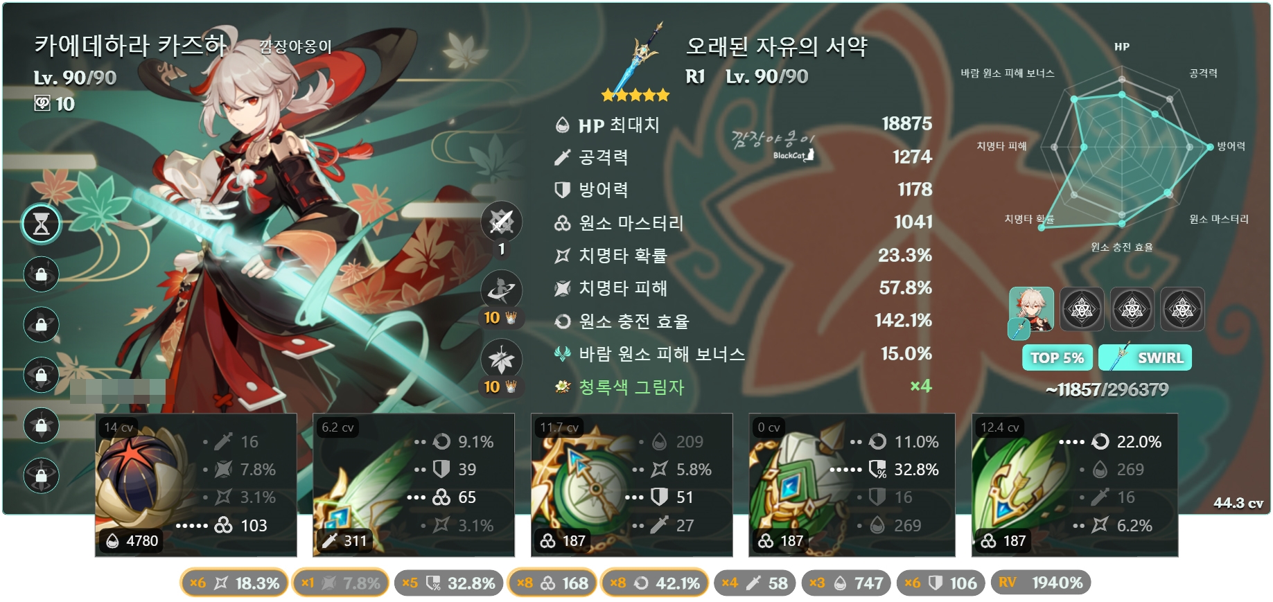 현재 제가 사용중인 카즈하의 성유물과 능력치입니다. 소과금 유저라 전무는 인색한 편이지만 카즈하는 전무를 뽑아줘야죠! ㅋ