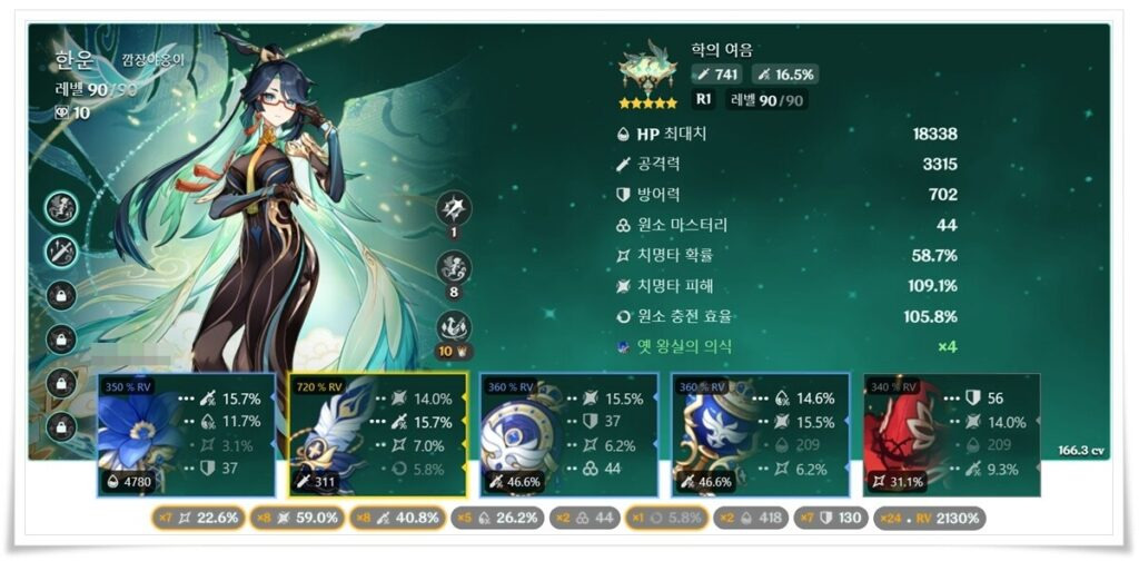 힐러의 딜 능력을 보완해 줄 수 있는 성유물로 ‘바다에 물든 조개’를 사용하셔도 됩니다. 하지만 한운과의 조합은 ‘지난날의 노래’가 더 좋으나 갈망효과를 끊기지 않고 유지하기 쉽지 않다는 단점이 있습니다. 하지만 '소'파티에 한운을 사용한다면 최고의 성유물이 '지난날의 노래'입니다.