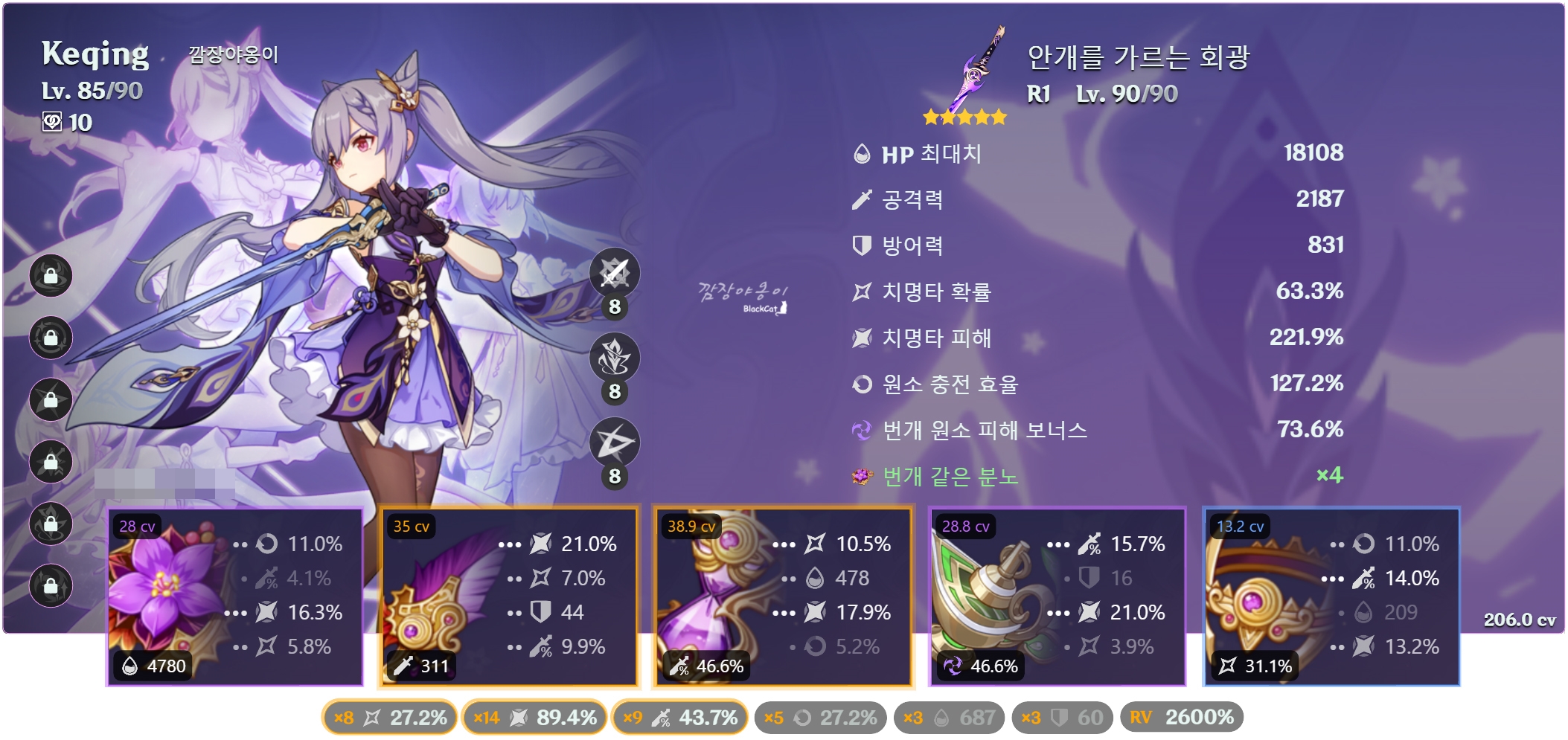 메인 딜러인 만큼 치명타 피해, 치명타 확률 뿐만 아니라 공격력도 올려줘야 하는 캐릭터입니다. 특히나 각청의 경우 대부분 풀원소 캐릭터들과 시너지를 내야 해서 원소 마스터(200~250)도 유효옵션 중 하나라 없는 것 보단 있는게 좋아 골고루 올려줘야 합니다.