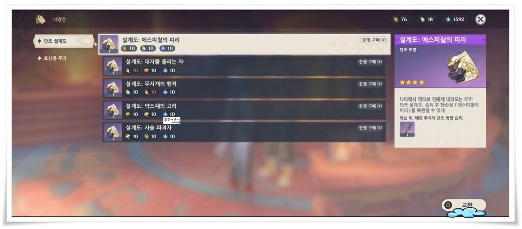 첫 방문이시라면 단조무기 설계도를 획득 하셔야 하는데요. 총 5개의 나타 단조무기 설계도를 획득하기 위해선 6종류의 아이템을 채집하셔서 알롬에게 돌아와 교환을 하시면 됩니다.