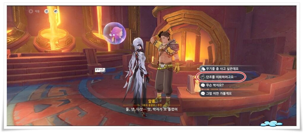 대장장이 NPC인 알롬을 찾으셨다면 알롬과의 대화를 통해 '단조를 의뢰한다'를 선택하시면 됩니다.