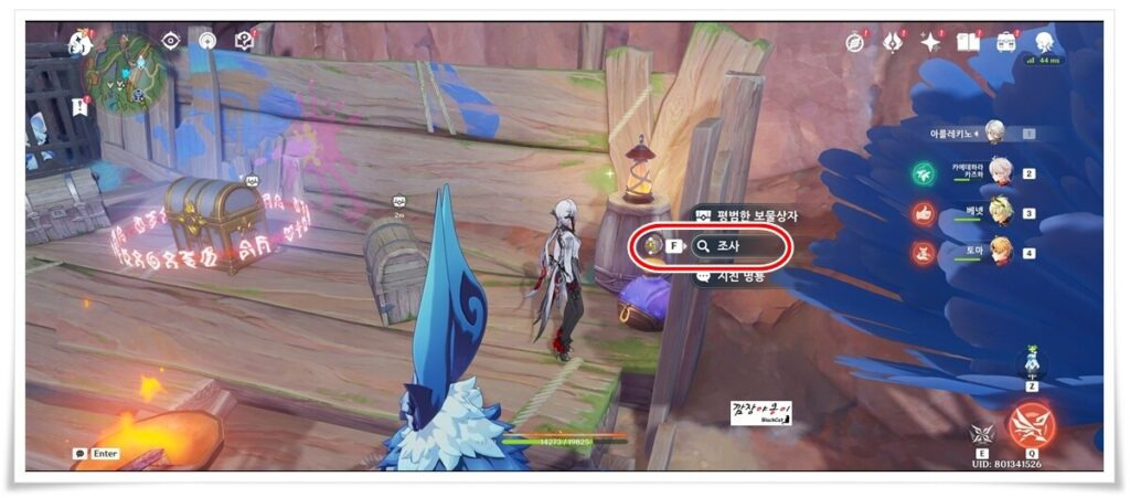 NPC마무르 뒷편이자 3개의 보물상자 중 가장 오른쪽 보물상자가 있는 곳 옆으로 가시면 '조사'가 뜹니다.