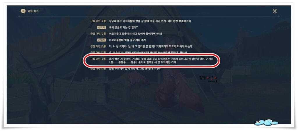 움막 속에 있는 근심 어린 깃룡과의 대화를 통해 다음 힌트를 얻을 수 있습니다.
