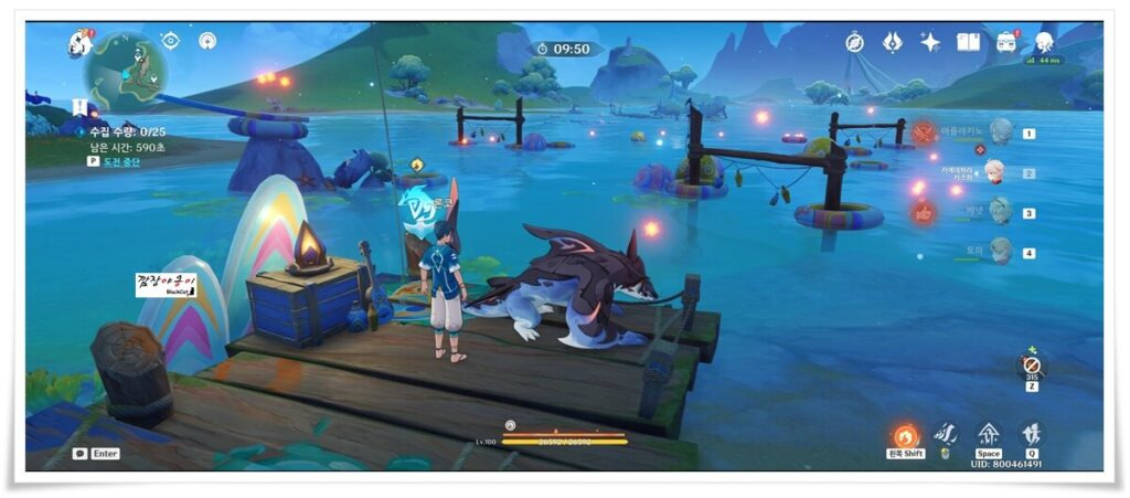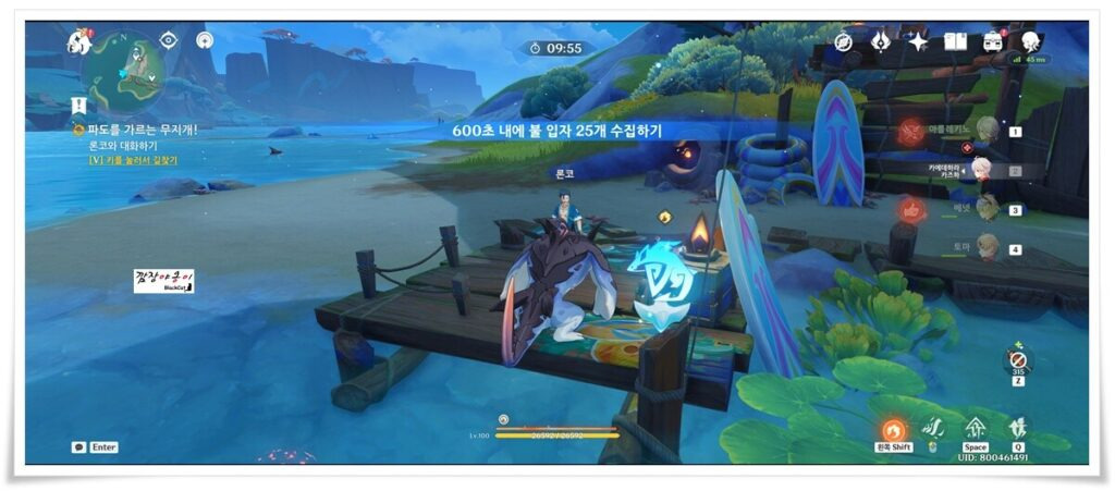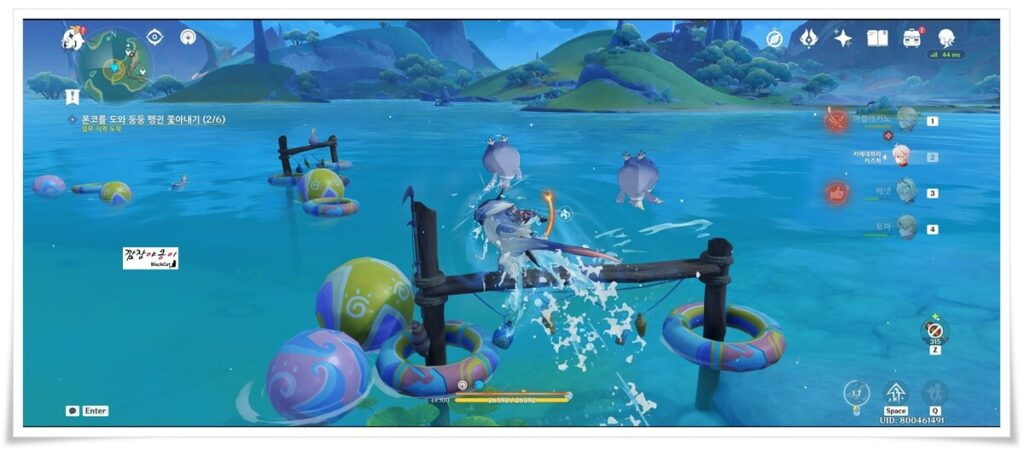 미션을 받게 되면 어룡으로 변해 퀘스트를 수행하면 되는데요. 물 위 훈련장 시설물에 올라가 있는 통통 펭귄들을 찾아 어룡으로 몸통박치기를 해서 구조물 아래로 떨어뜨리기만 하면 됩니다.