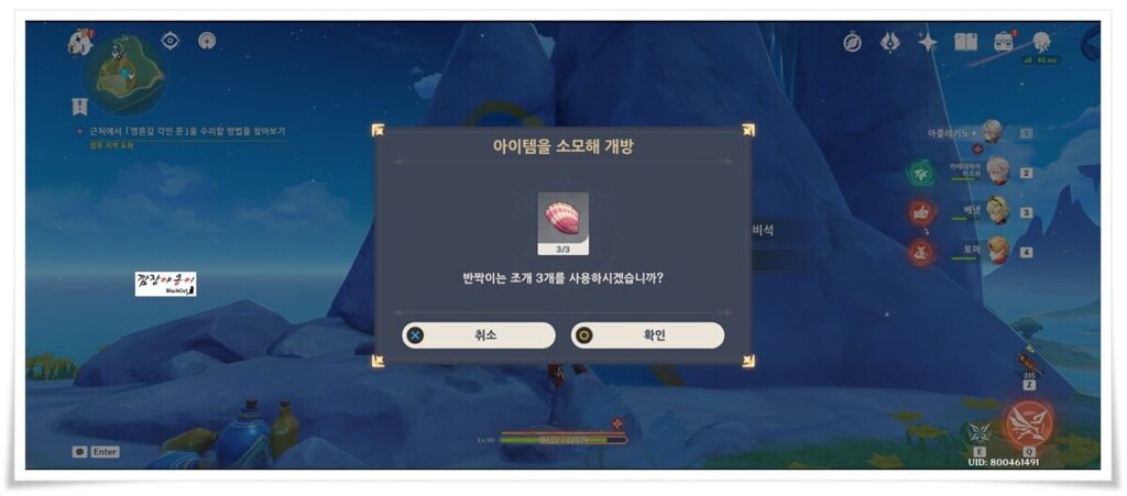 방금 통통 펭귄을 치운 훈련장 중간 중간에 보시면 조개들이 있는데 조개 3개를 먼저 습득해야 합니다.