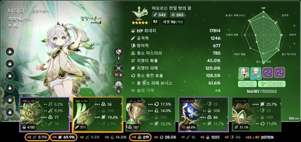 현재 제가 사용중인 나히다의 성유물과 능력치입니다. 수메르가 나오고 캐릭터 풀이 약하던 시절에는 변칙 파티로 가성비덱을 맞춰서 아주 요긴하게 사용했던 캐릭터가 풀의 신 나히다인데요.