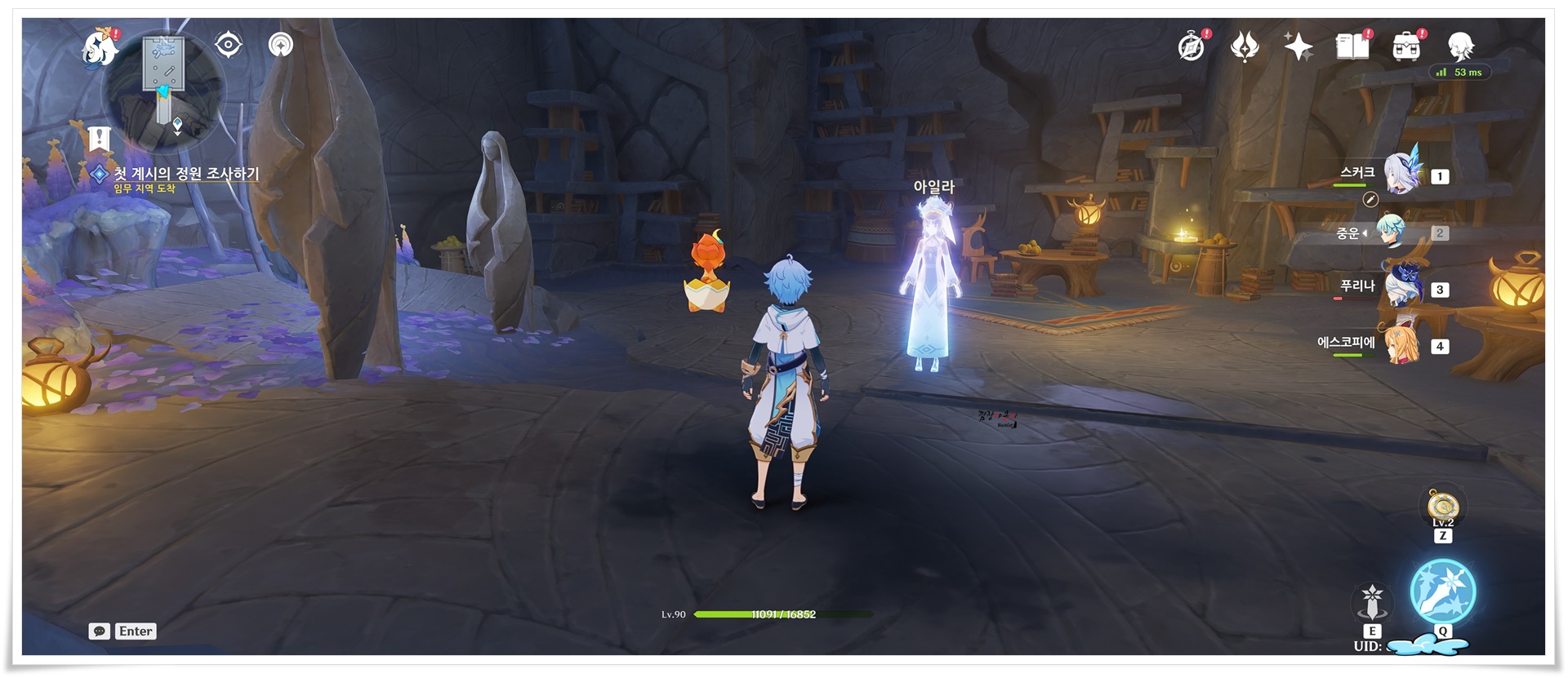 위로 올라가면 유령처럼 생긴 NPC 아일라가 있습니다. 그녀와 대화를 하세요.