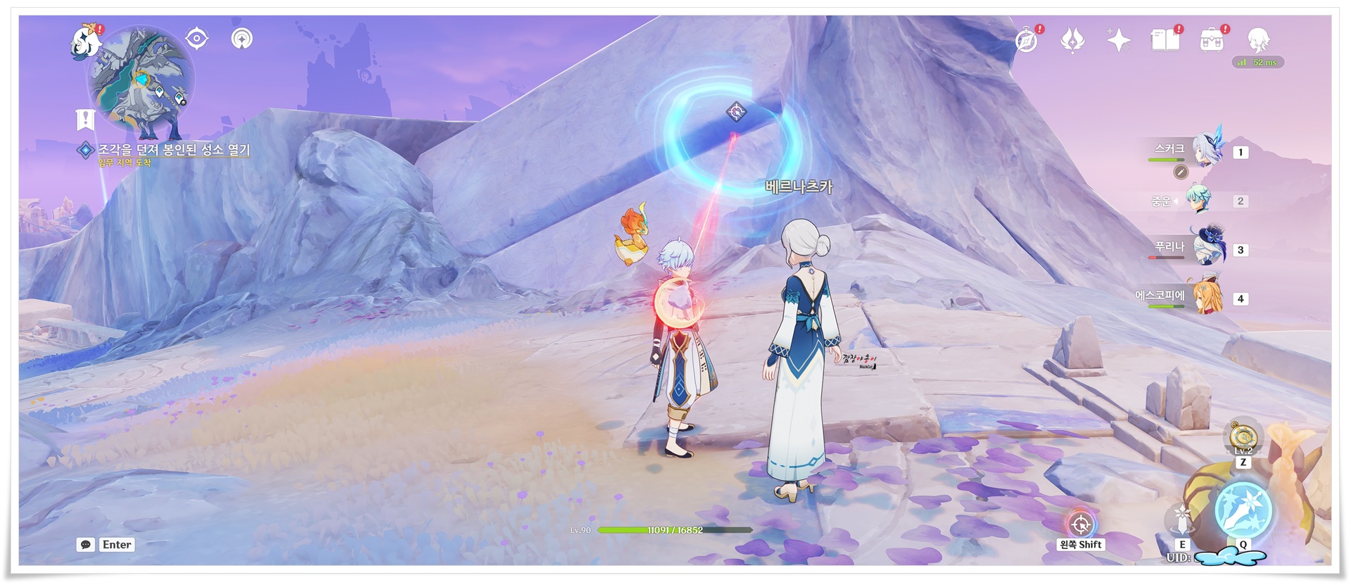 「푸른 섬을 위해」를 클리어 하시면 신의 눈동자를 덮고 있던 막이 사라지셨을텐데요. 막이 사라지는 것 까지 보시고 다시 '눈부신 제단'으로 돌아가면 NPC 베르나츠카를 통해 계속해서 퀘스트를 진행 할 수 있답니다.