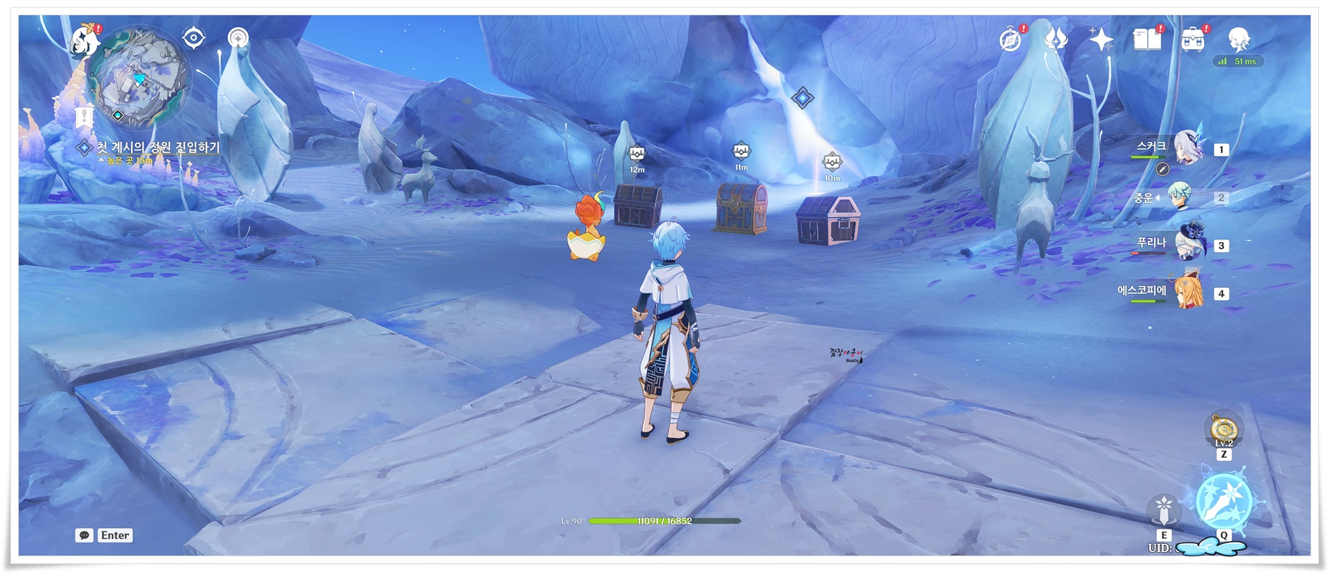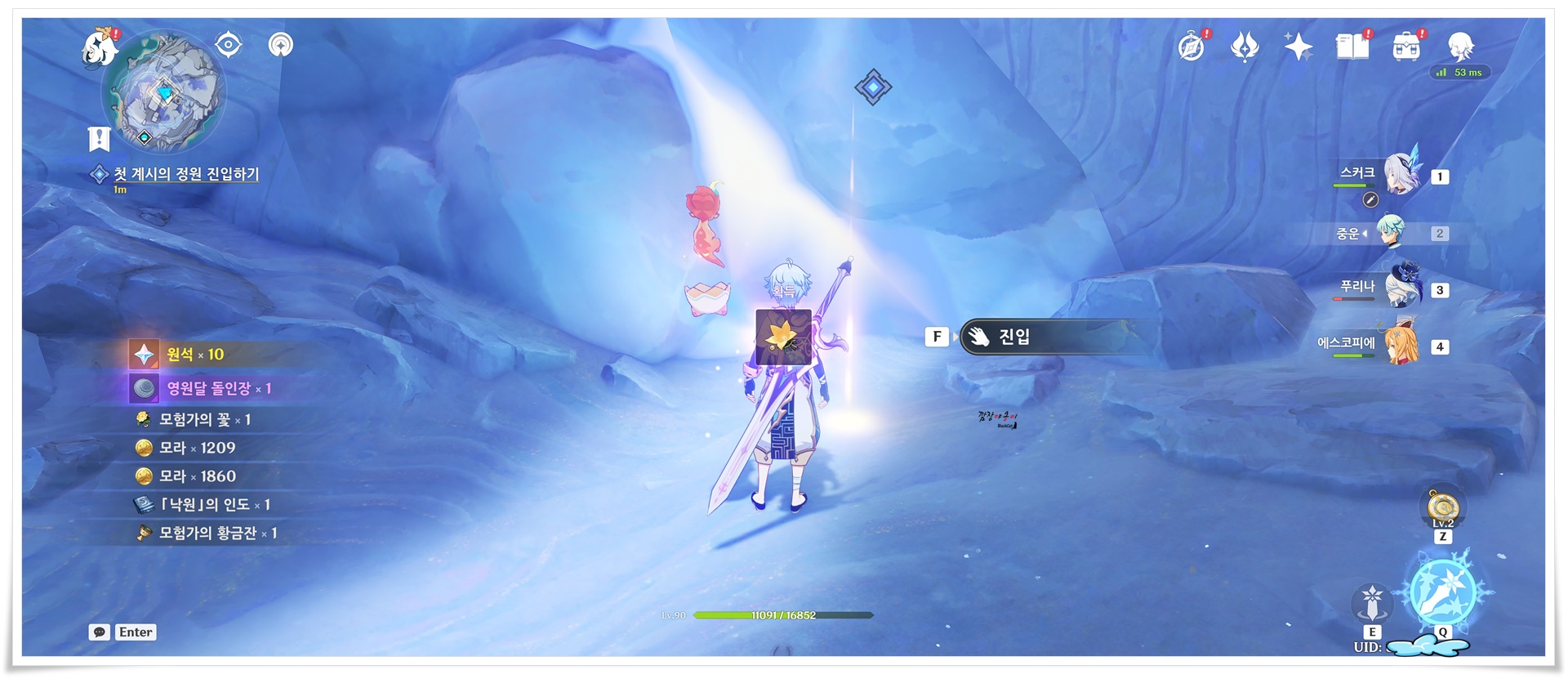 바닥에 떨어져 있는 돌을 주워 푸르게 빛나고 있는 원으로 돌을 던져 넣으시면 됩니다. 이번 노드크라이 일퀘 등에서 많이 나와서 돌을 잡아 던지는 건 매우 쉽게 하실 수 있을 거 같네요.