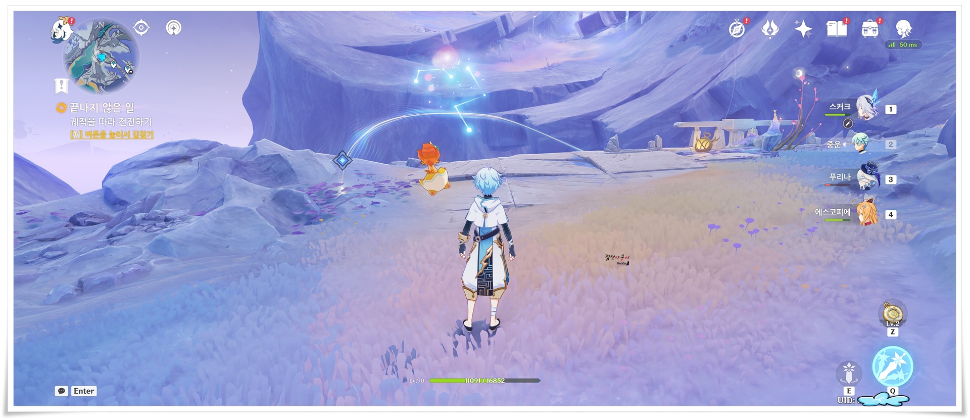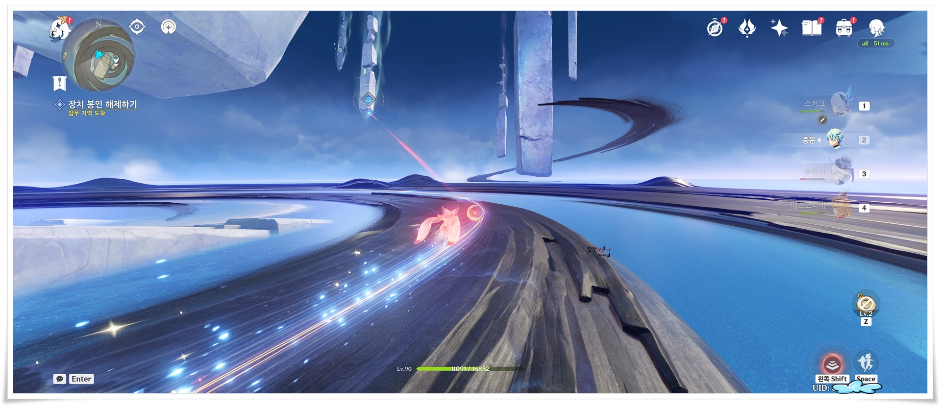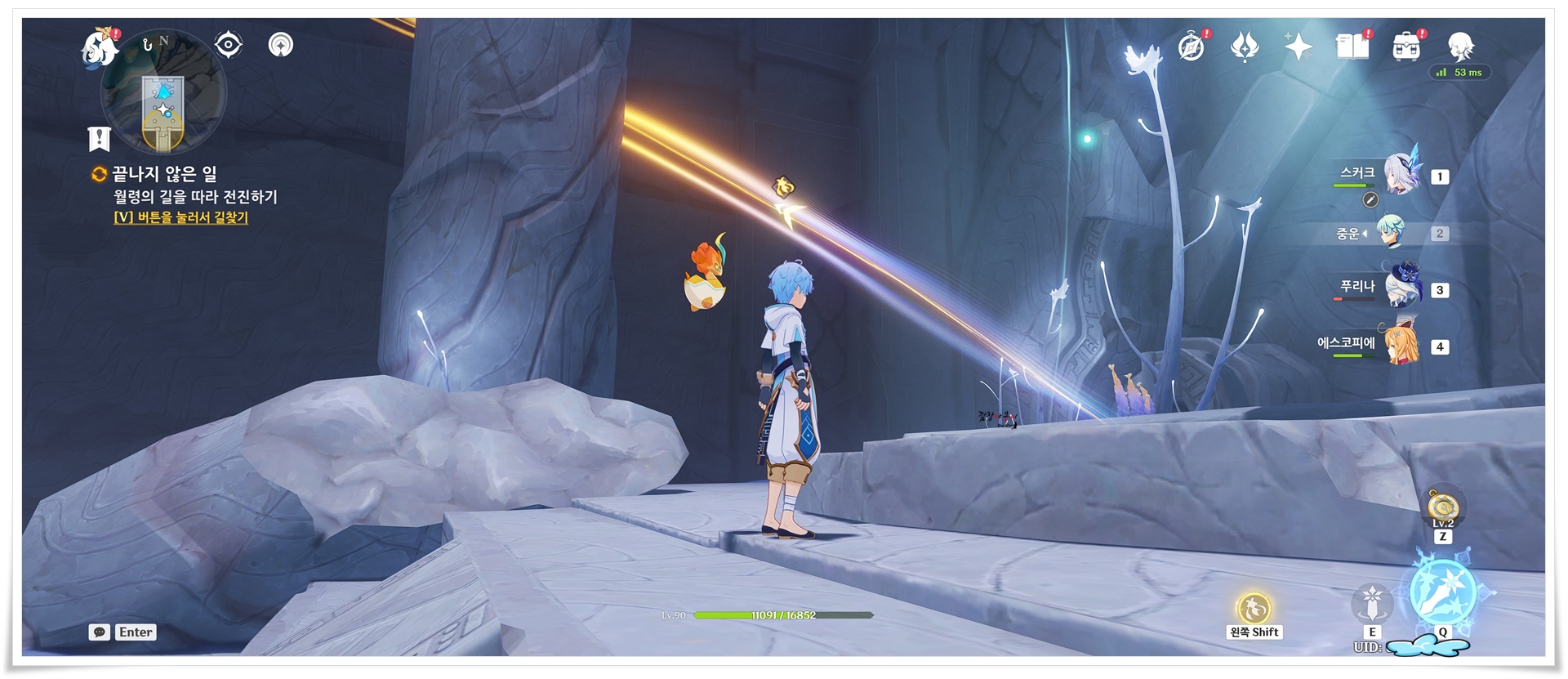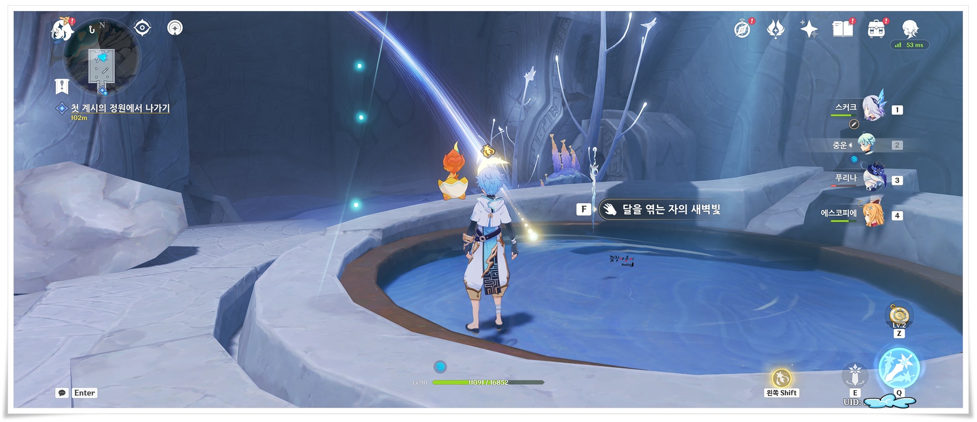 베르나츠카와 대화 후 물웅덩이를 조사하고나면 월령을 따라 위로 올라가는 문레인이 나타납니다. 문레인을 타고 위로 이동합니다.