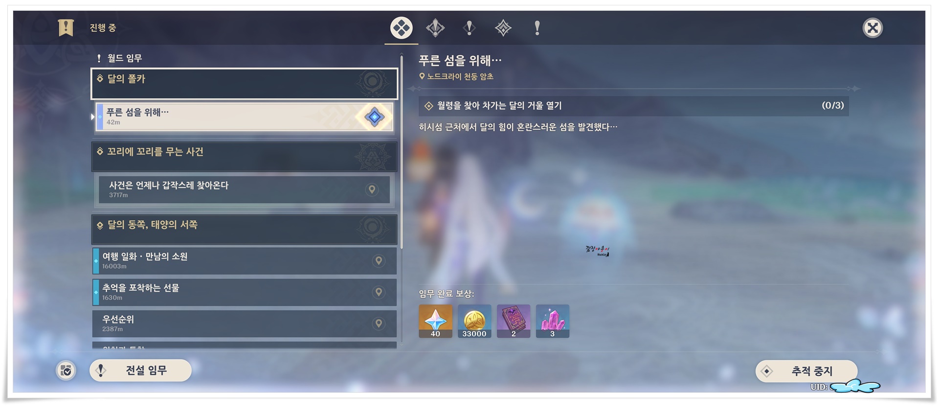 월드 퀘스트 「돌에 깃든 돌」,「거울, 미궁 그리고 국왕」, 「신기루의 선물」, 「푸른 섬을 위해」까지 깨셔야만 계속해서 진행이 가능하니 위 나열한 월드임무부터 하고 오세요!!