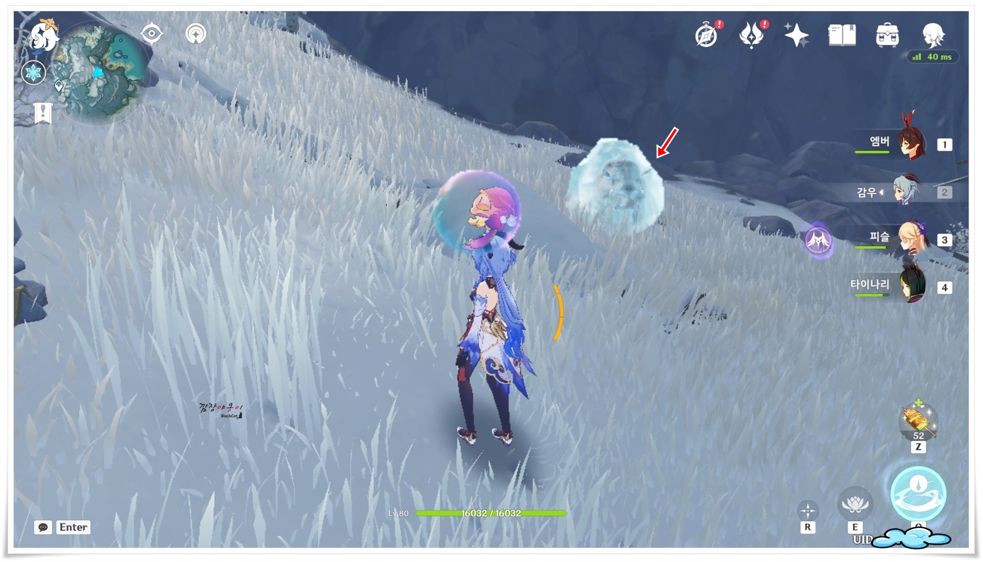 화살표로 표기해둔 얼음을 불속성 캐릭터를 이용해 녹여주면 멧돼지가 나타날텐데요. 위쪽에 3마리 아래쪽에 1마리해서 총 4마리의 멧돼지를 먼저 잡아주세요.
