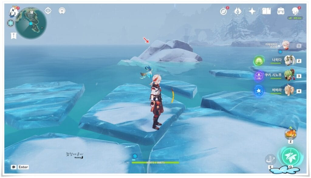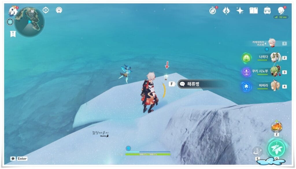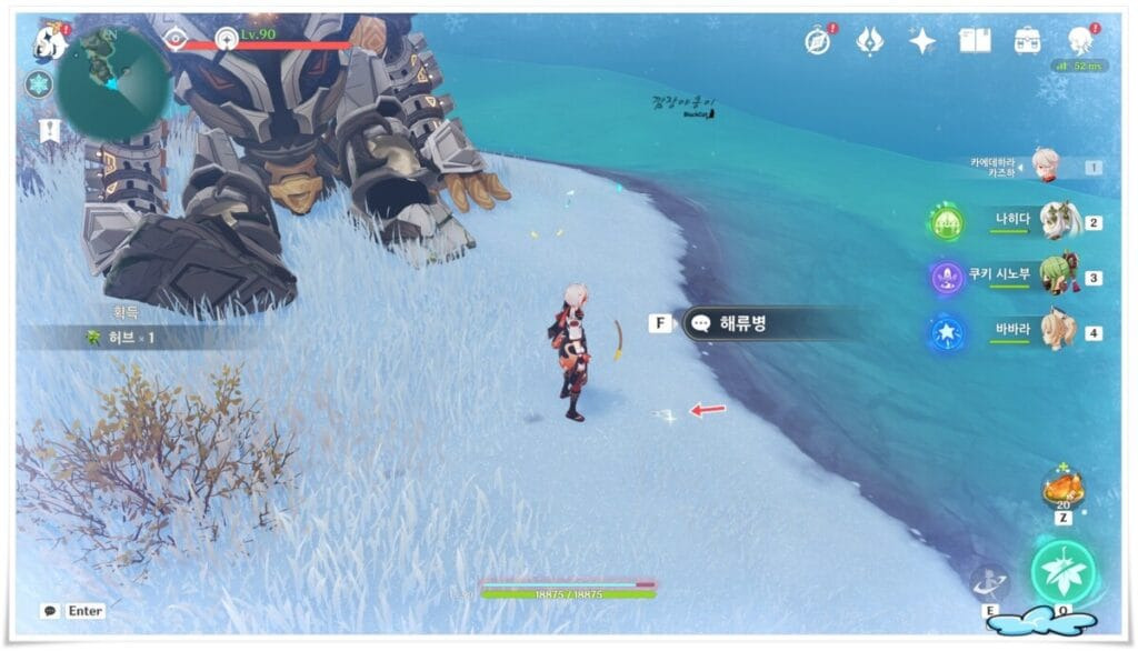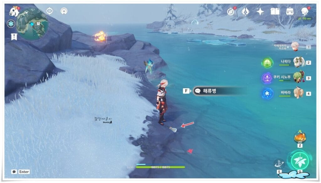 두번째 병의 위치는 지도상 작은 섬에 있습니다. 바로 뒤쪽에 몸을 녹일 수 있는 화로가 있으니 얼음 게이지가 가득 차신분은 뒤에서 몸을 녹이고 오시면 됩니다.