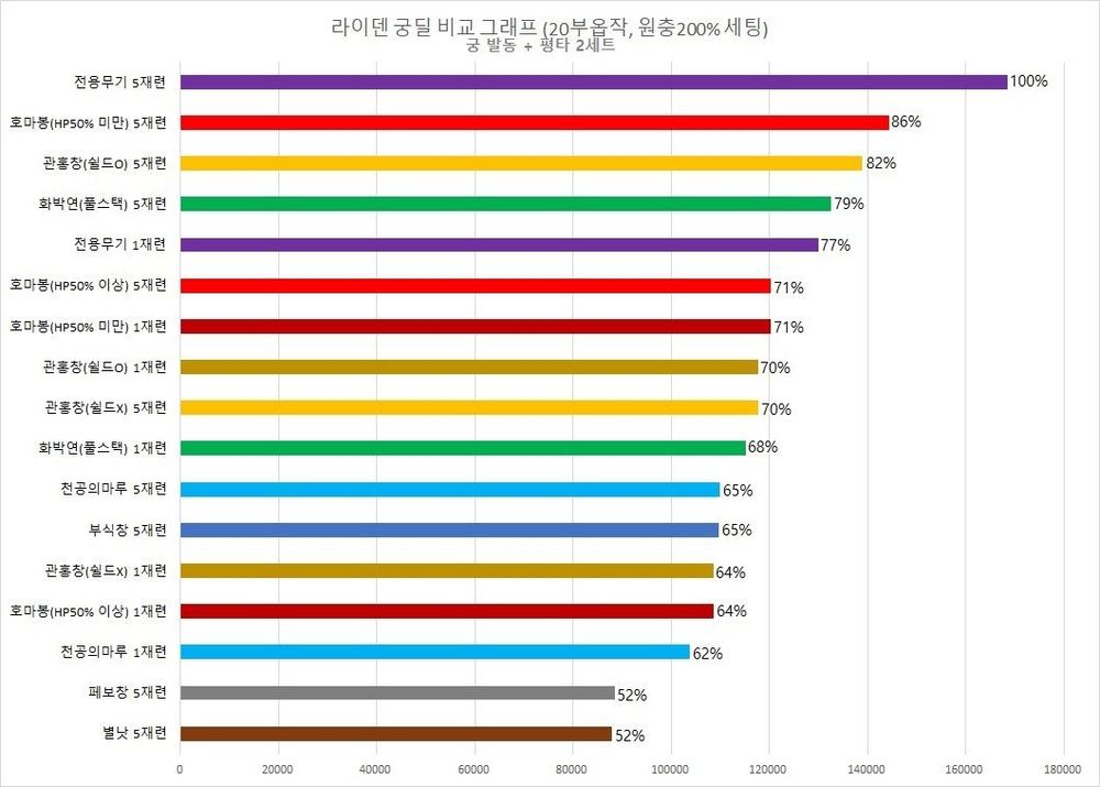 다른 커뮤니티에 올라와 있는 쇼군의 무기별 효율표입니다. 전무인 '예초의 번개' 5재련을 100으로 봤을때 다른 무기들에 대한 궁딜에 대한 비교로 무기 선택시 도움이 되실 듯 합니다.