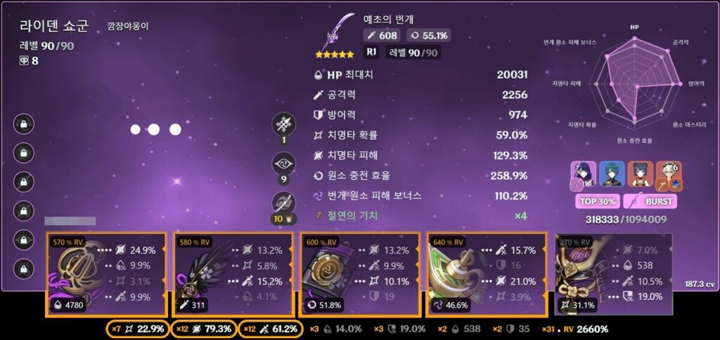 원소충전효율과 치명타 피해, 치명타 확률을 모두 맞춰야 합니다. 성배에서 공격력%와 번개원소피해 어떤 것을 선택해도 상관없으며 실제 데미지 차이는 크지는 않습니다. 다만, 파티에 6돌 사라가 있다면 번개원소피해가 더 좋고 사라가 없거나 명함 사라인 경우에는 공격력%를 하셔도 데미지 차이는 크지 않아 자신의 공격력이 낮다면 성배에서 공격력%를 사용하시는 것도 나쁘지 않은 선택입니다.