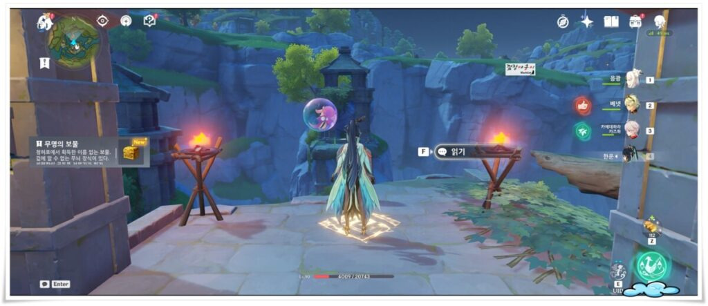 바위의 인장 5개를 모두 활성화하고 처음 퀘스트를 받았던 비석이 있던 장소로 돌아가시면 '화려한 보물상자'가 나타나고 '무명의 보물'이라는 아이템도 하나 획득 할 수 있답니다.