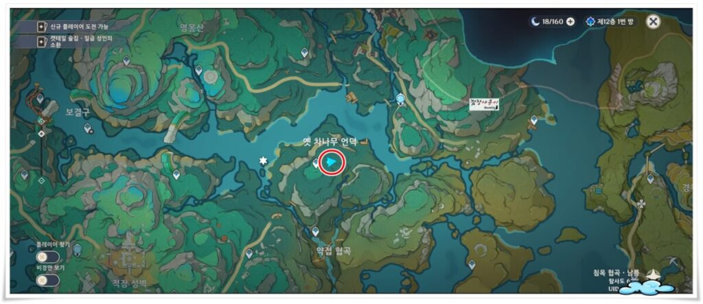 이제 「오래 지속되는 주전자 속 경치」 히든업적 달성을 위한 두번째 단계로 넘어가 보겠습니다. 위 지도에 표기해둔 곳으로 가시면 아주 큰 나무가 하나 있을 텐데요.
