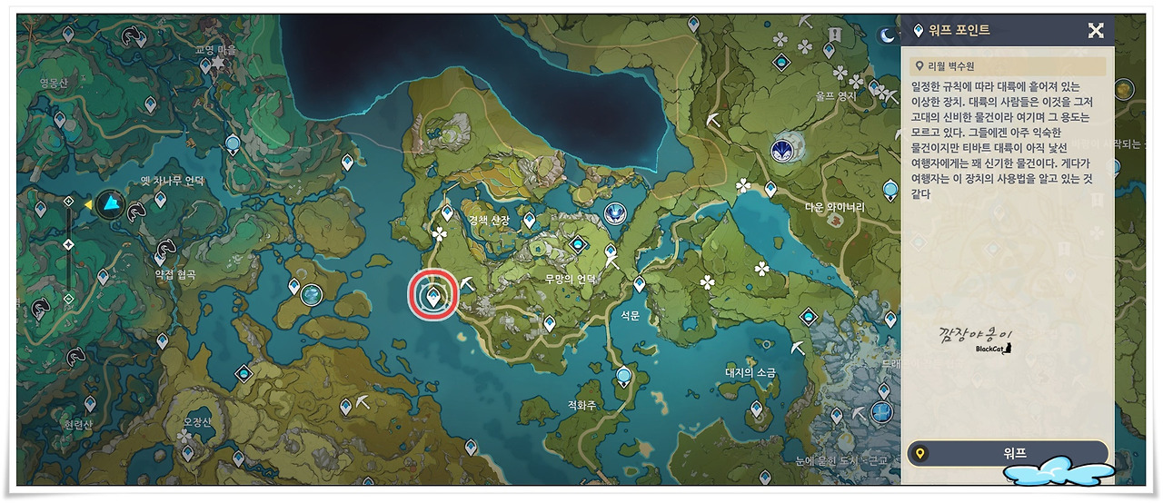 폰타인으로 가도 나에게 덤벼드는 멧돼지가 출몰하는 곳이 있으나 대부분의 유저가 편안하게 방문하기엔 몬드지역 '무망의 언덕'과 '경책산장' 사이에 있는 워프포인트가 편리하겠죠?
