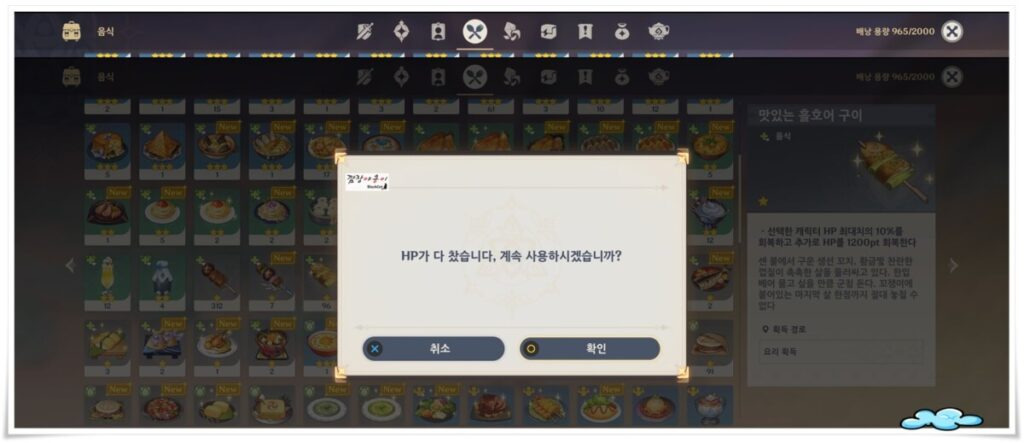 이제 음식 '사용하기'를 이용해 현재 파티의 캐릭터들에게 먹입니다. 체력이 다 차면 위 사진처럼 'HP가 다 찼는데도 사용할거냐?'라고 물어보는데 신경쓰지 마시고 '사용하기'를 클릭합니다.
