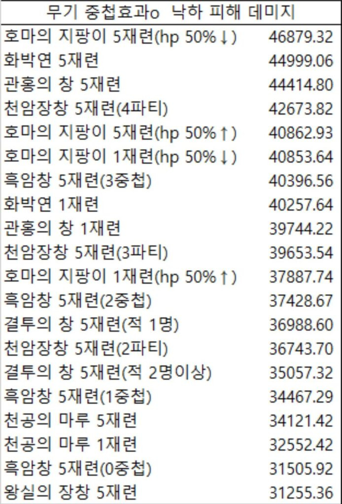 | 재련시 주변에 적이 2기 이상 있을 때 공격력이 16/20/24/28/32%, 방어력이 16/20/24/28/32% 증가한다. 주변에 적이 2기 미만일 때 공격력이 24/30/36/42/48% 증가한다. 진주기행 30랩 보상으로 구매할 수 있는 무기로 유료아이템이라는 단점이 있으나 치명타 확률이 오히려 화박연보다 높고 공격력 상승 옵션이 있어서 재련을 할 수 있다면 좋은 무기입니다. |