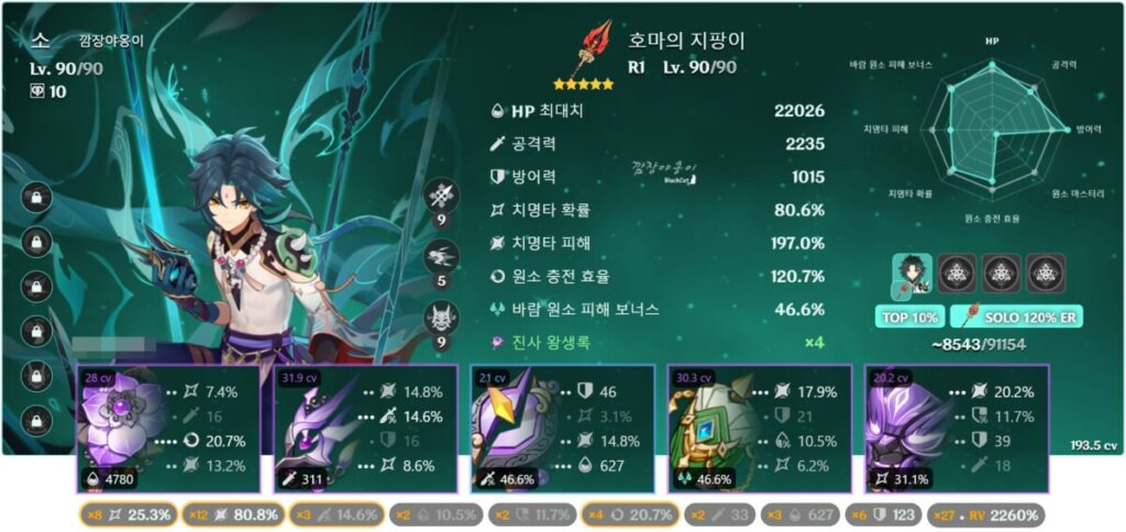특히나 공격력이 높은 캐릭터인데다 레벨 돌파스탯이 치명타 확률이라 더더욱 딜러인 ‘소’에겐 이점으로 다가오고 있습니다.