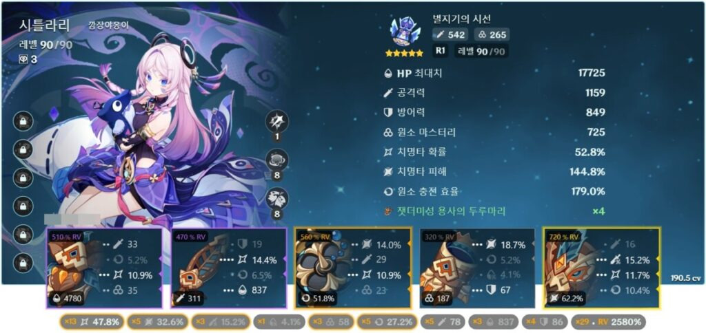 1. 별지기의 시선/ 5성 90렙 기준 능력치 주 옵션: 기초 공격력 542 부 옵션: 원마 265 |