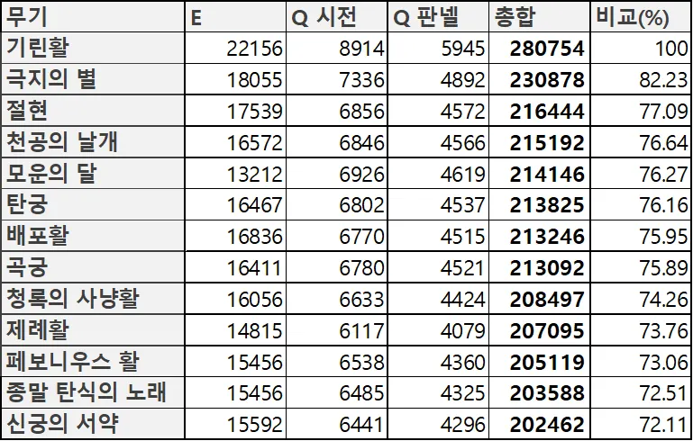 다른 커뮤니티에 올라와 있는 야란의 무기별 딜링표입니다. 자신이 가지고 있는 무기는 전무대비 얼마의 효율을 낼 수 있는지 확인하는 용도로 사용하시면 될거 같네요.