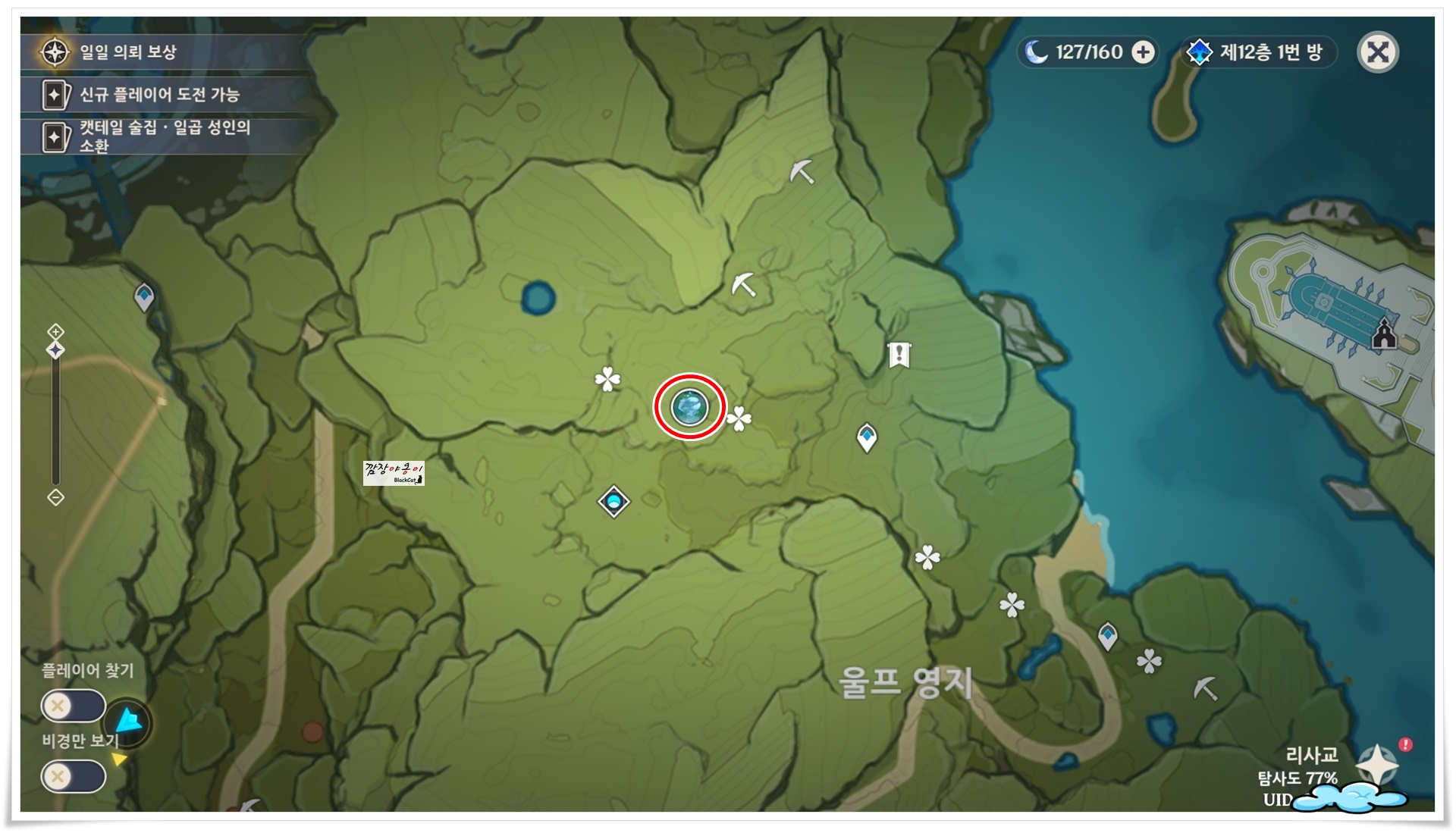 지도에 표시된 곳을 가면 이렇게 생긴 것이 보일텐데요. 딱 보면 알 수 있으시겠죠? 색상이 파란색이니 이건 '계시의 꽃'으로 경험치 책 위주로 드랍을 하는 지맥입니다.