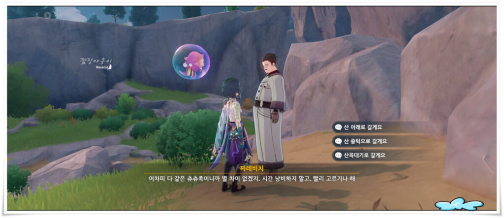 NPC짜레비치와 대화를 하면 산 아래/ 산 중턱/ 산 꼭대기 중 하나를 선택하라고 하는데 산 아래/ 산 중턱/ 산 꼭대기를 모두 한번씩 하셔야 합니다.
