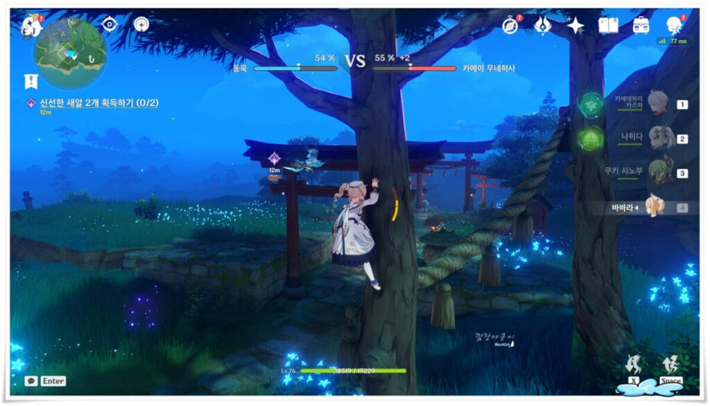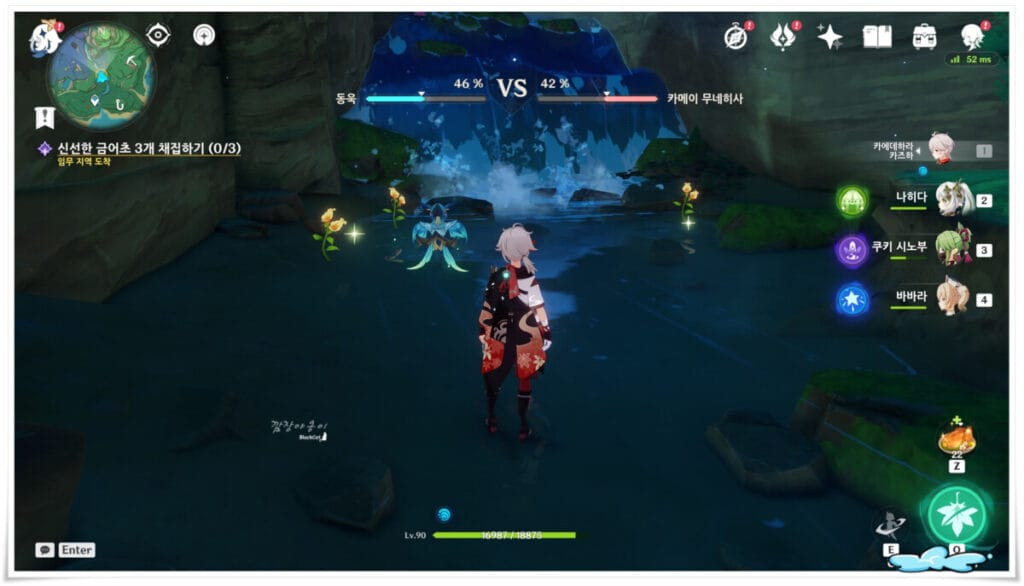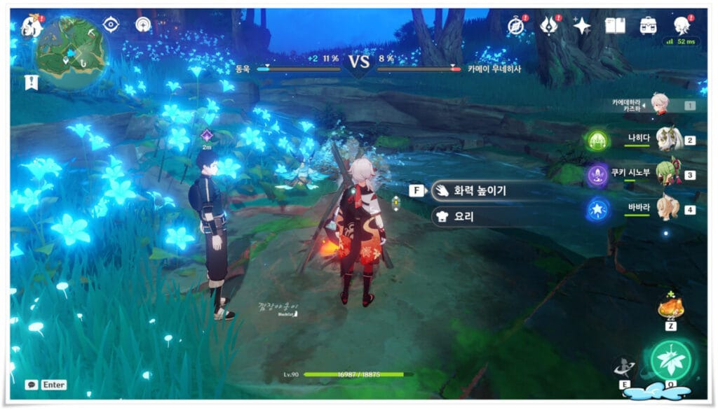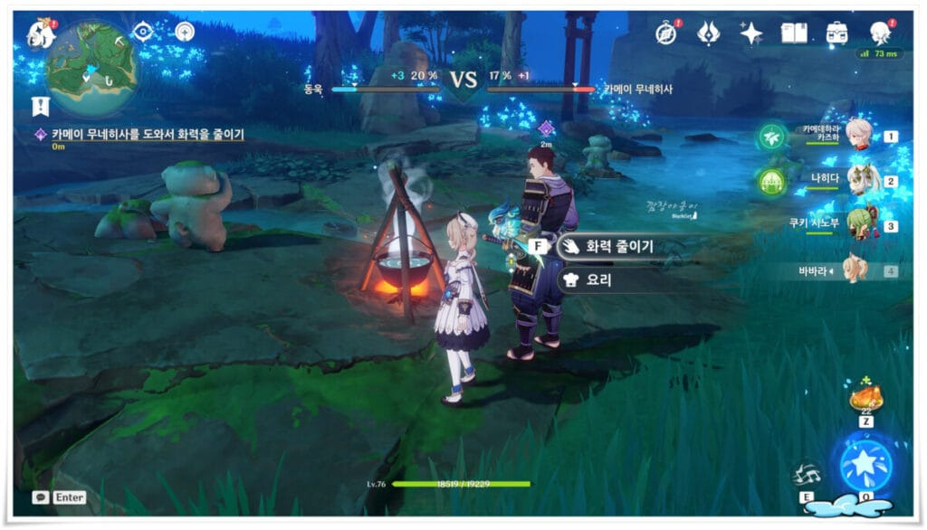 원신 이나즈마에서 발생하는 퀘스트, 미식어벤져스 '요리대결'이 생성되면 이나즈마 '진수의 숲'에서 NPC동욱을 만나야 합니다. 동욱은 NPC카메이 무네히사와 함께 있고 이 둘은 심판겸 도우미인 행자와 함께 요리대결을 펼치는데요.