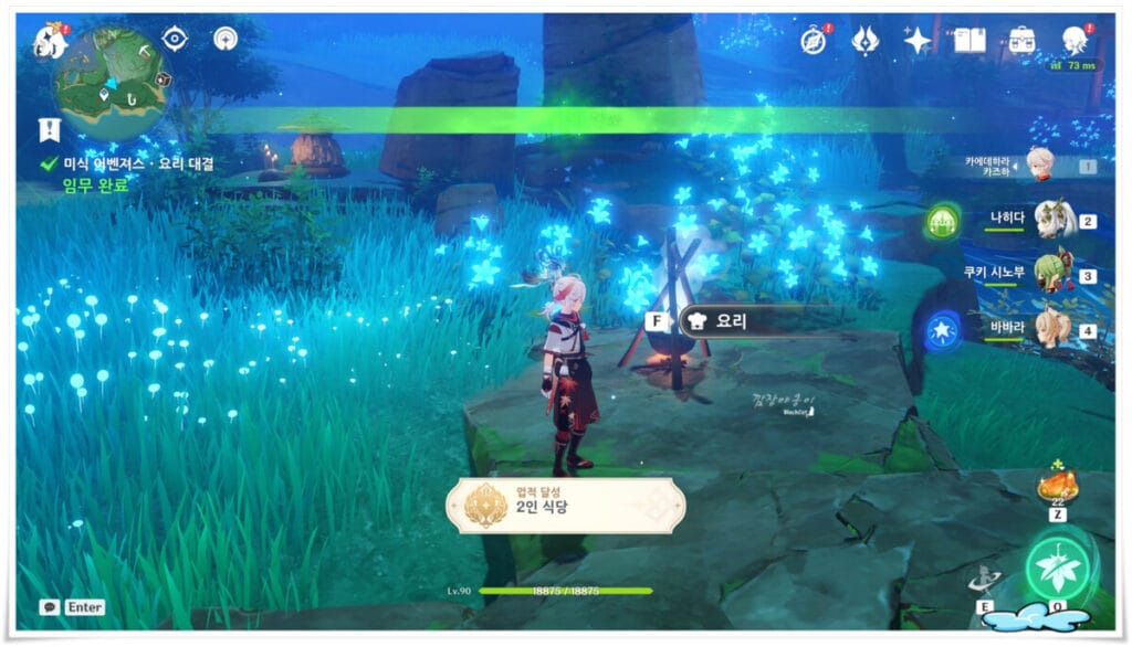 미식어벤져스와 관련된 퀘스트는 몇가지 있으며 일부는 순서대로 해야 다음 퀘스트가 발생하기도 하는데요. 오늘 함께해볼 🔍원신(홈페이지) 이나즈마 일퀘 중 하나인 미식어벤져스 퀘스트로 연관되어 있는 퀘스트가 여러개 있는데 이중 '요리대결'입니다. 마지막에 업적 '2인식당'도 획득 하실 수 있습니다.