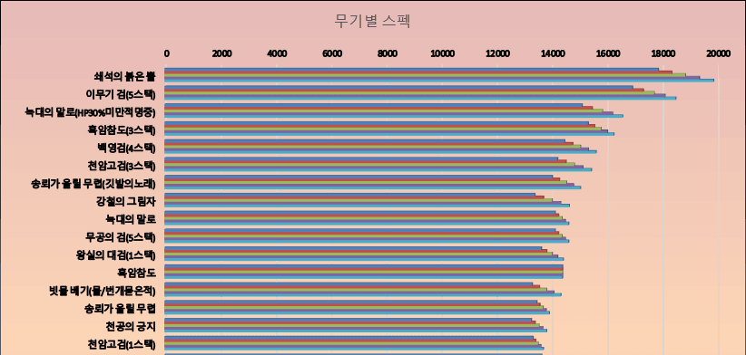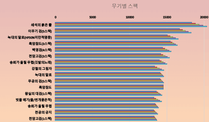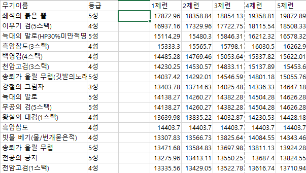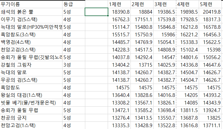 다른 커뮤니티에 올라와 있는 무기별 효율표입니다.