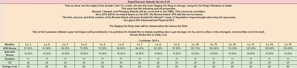 2돌파시엔 원소 폭발의 쿨타임을 줄여주는데 최대의 시너지를 위해선 파티내 바위 속성의 캐릭터가 3명이 있어야 합니다. 원소 폭발이 이토 딜의 핵심이기에 게이지 수급에 도움이 됩니다. 특히 1돌파와 시너지가 좋습니다.