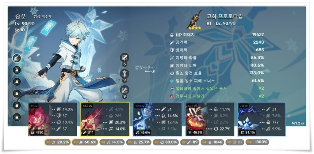 스커크 파티에 중운을 사용할 경우 무기에 따라 성유물 옵션이 달라집니다. 제례대검이나 페보대검을 사용할 경우엔 공%, 원충%/ 얼음, 공%/ 치확, 치피 중 고르시고 물빛 마카이라를 사용할 경우엔 원마/원마/원마를 하시면 됩니다.