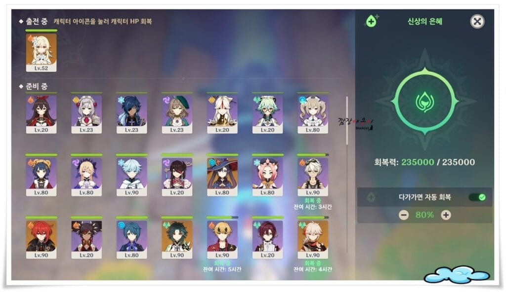 화면의 오른편에는 근처에 있을 경우 자동 체력회복 여부와 최대 체력 회복량을 선택 할 수 있고 화면 왼편에는 캐릭터들 이미지가 떠 있을텐데요.