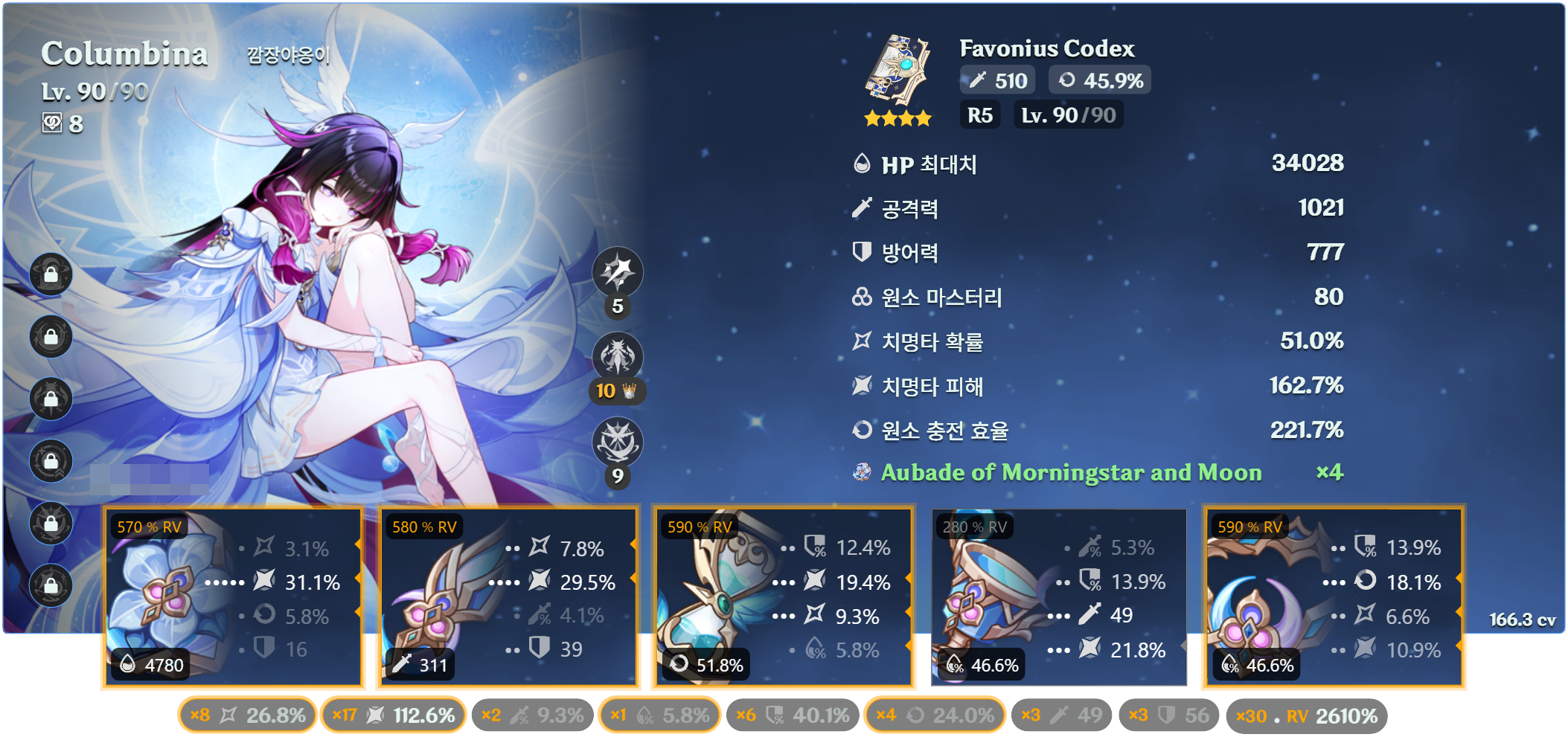 달감전 파티시에는 콜롬비나가 "달을 엮는 밤노래", 이네파가 "샛별과 달의 여명" 성유물을 착용하시는 것이 제일 효율이 좋습니다.