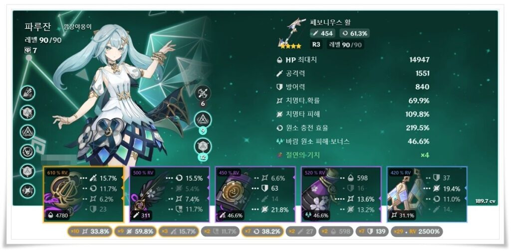 파루잔은 원소충전요구량이 높은 캐릭터로 절연 2세트/ 유배자 2세트/ 학사 2세트 중 택2를 선택해 원소충전을 최대한 끌어와도 되지만 원충을 충분히 채울 수 있다면 4세트 효과로 본인의 딜을 올릴 수 있는 절연도 괜찮은 선택지입니다.