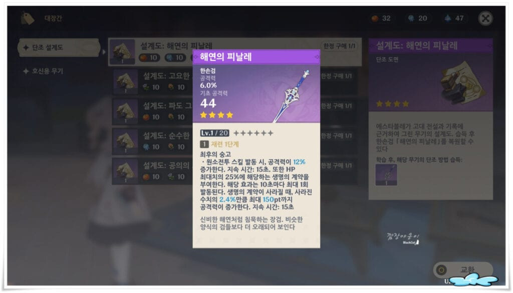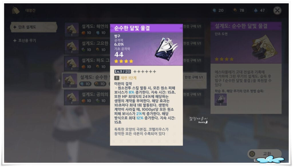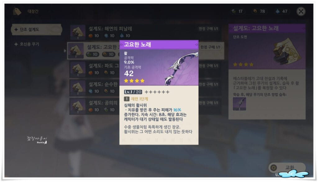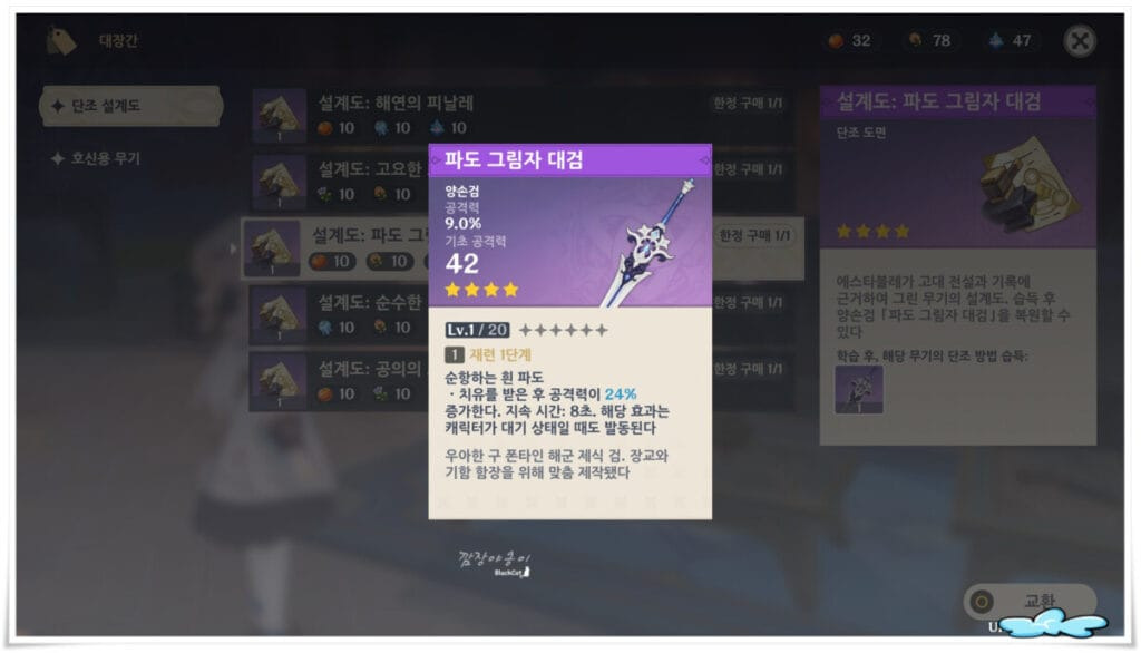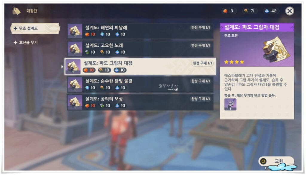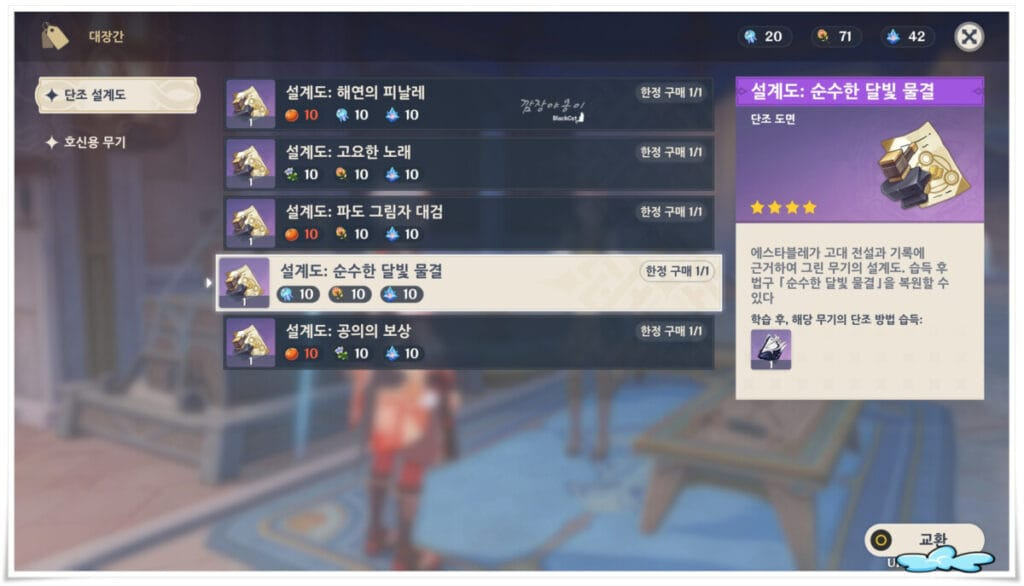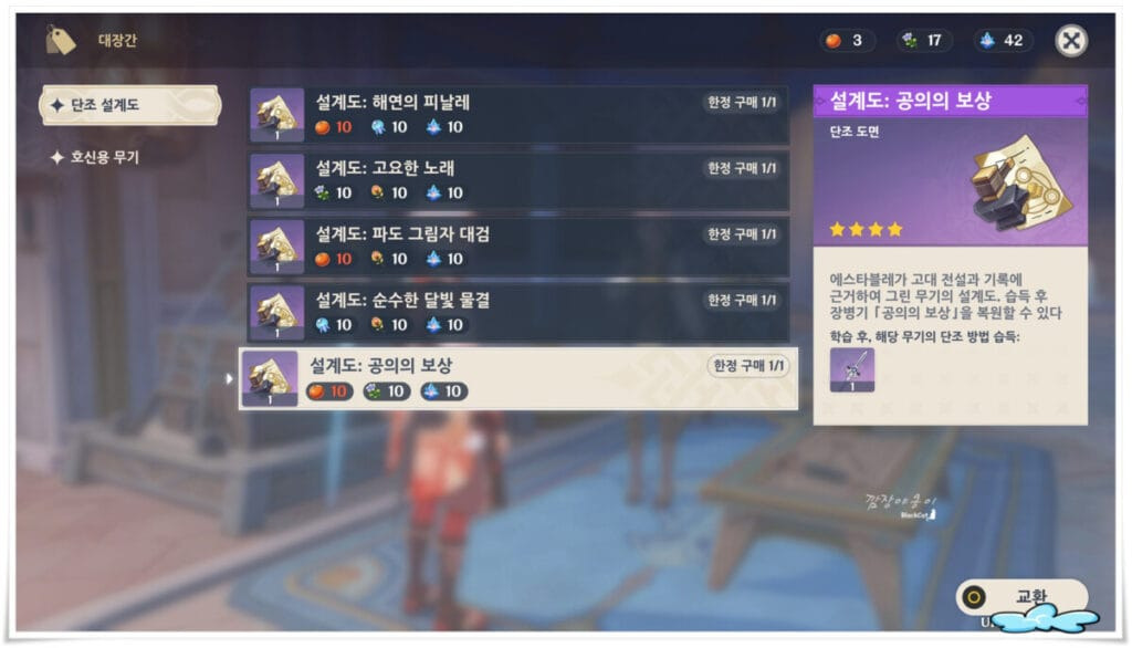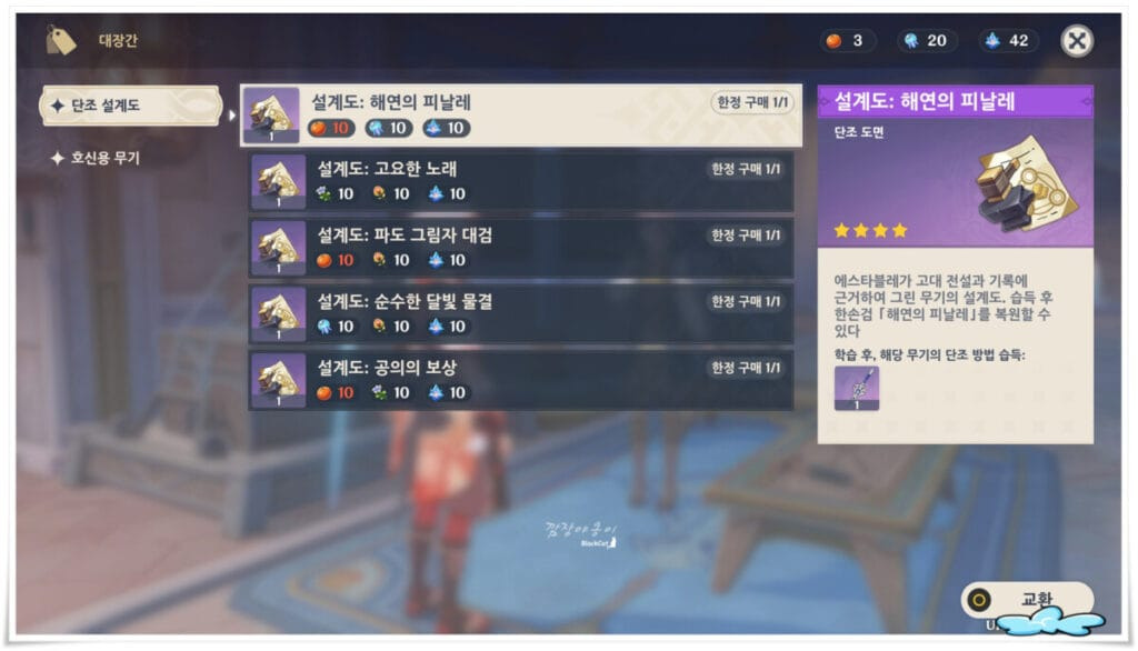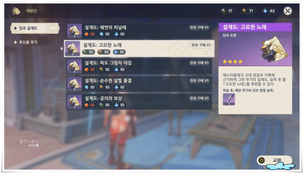 폰타인 단조무기의 설계도 역시 멀리 갈 필요 없이 NPC 에스타블레에게서 구매가 가능합니다. 다만 몇몇가지 재료가 필요하니 폰타인 지역을 탐험하면서 재료를 두해오셔야만 도면으로 교환이 가능합니다.