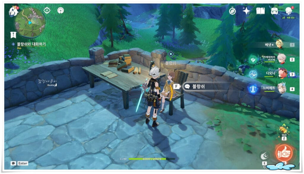 오두막집에 도착하면 우리를 기다리고 있는 NPC블랑쉬와 대화를 할텐데요. 어딘가에서 소리가 난다고 위치를 찾아라고 합니다.
