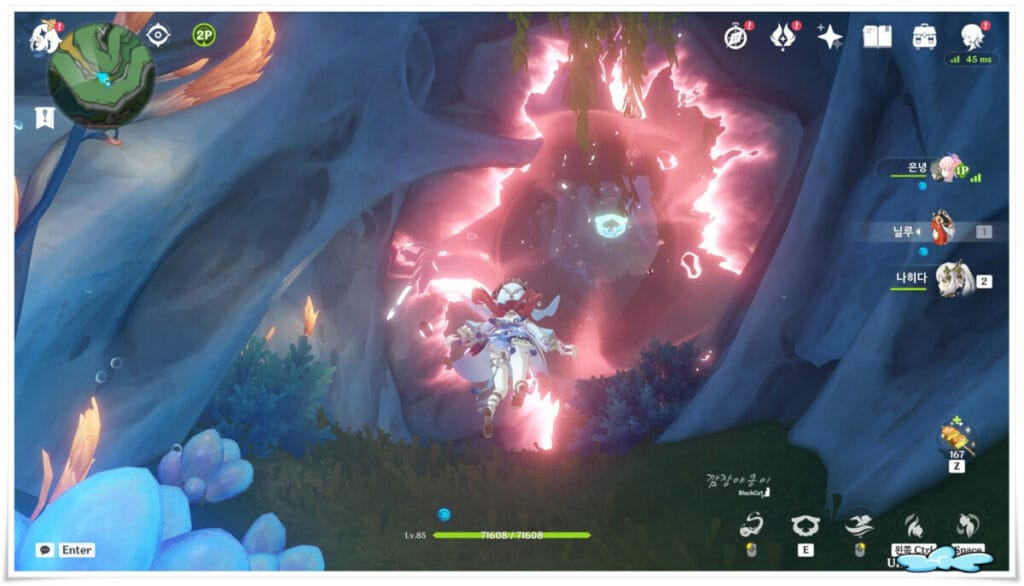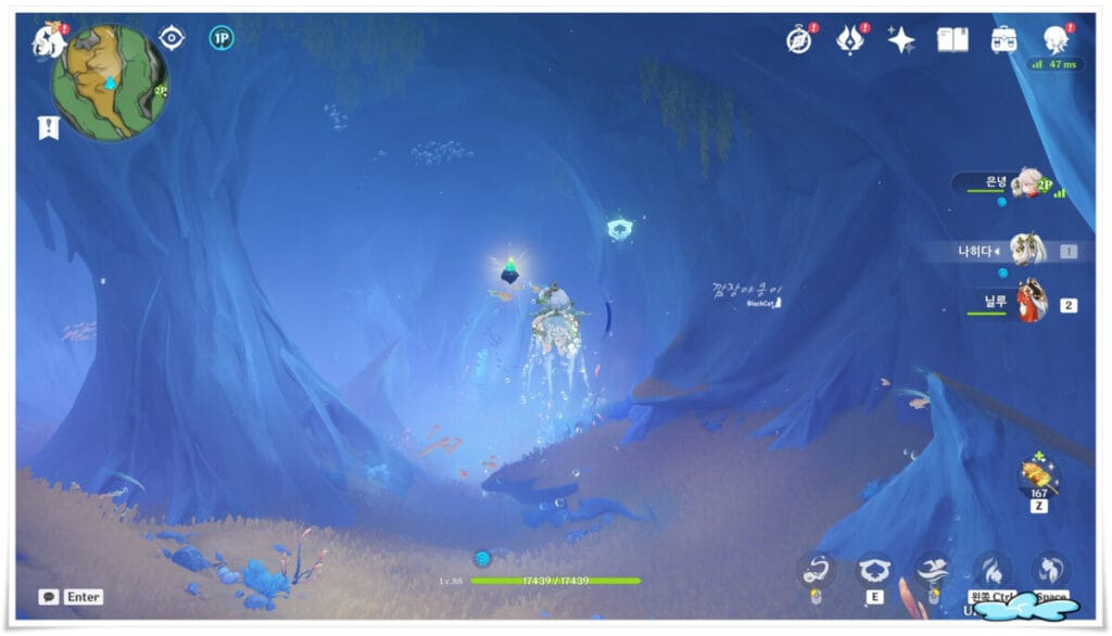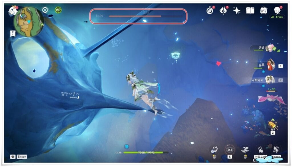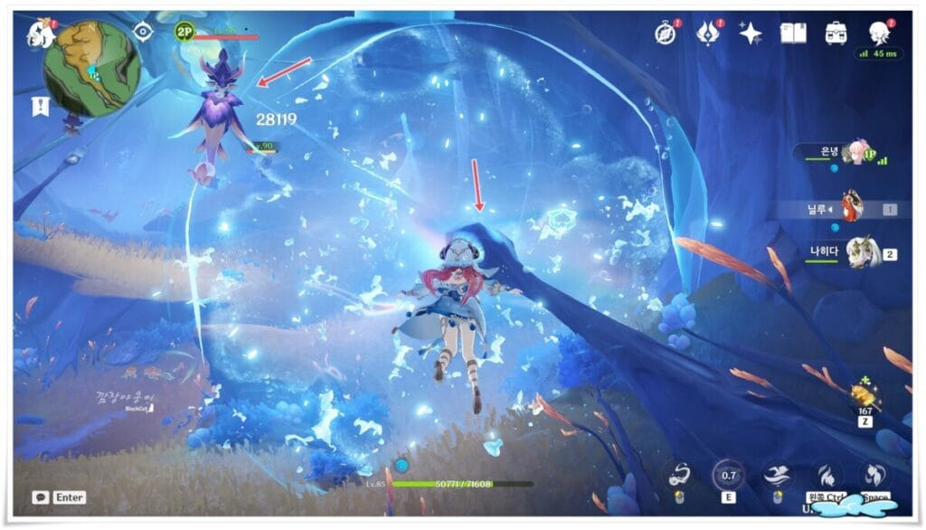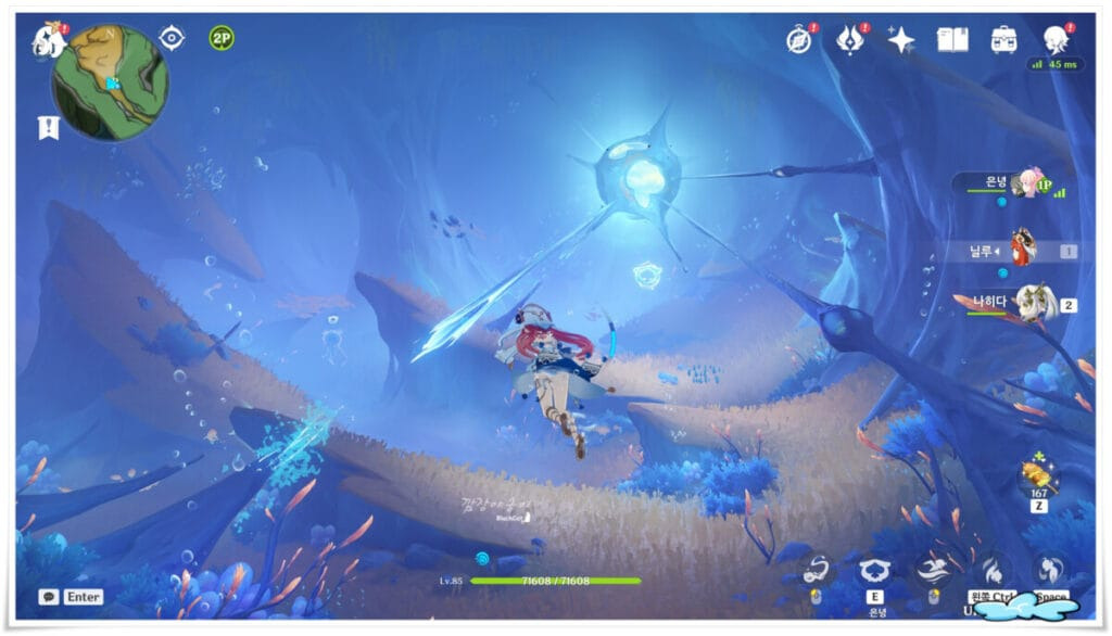 즉, 빨간색 일 때는 성게의 몸통의 스킬로 때리고 희미한 분홍색일때는 촉수의 밝게 빛나는 부분을 스킬로 때리고 나오는 몬스터를 잡으시면 됩니다. 중간 중간 캐릭터들의 피가 어느정도 빠졌다 싶으면 사망하기 전에 주위에 피랠 채워주는 물고기를 이용해 피를 보충하시면서 진행하시면 됩니다.