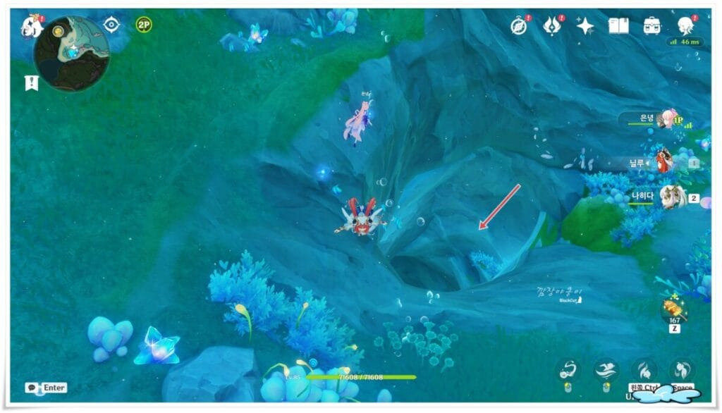 위 지도에 표기해둔 곳으로 오셔서 물속으로 잠수를 하시면 아래로 내려가는 동굴이 있습니다.