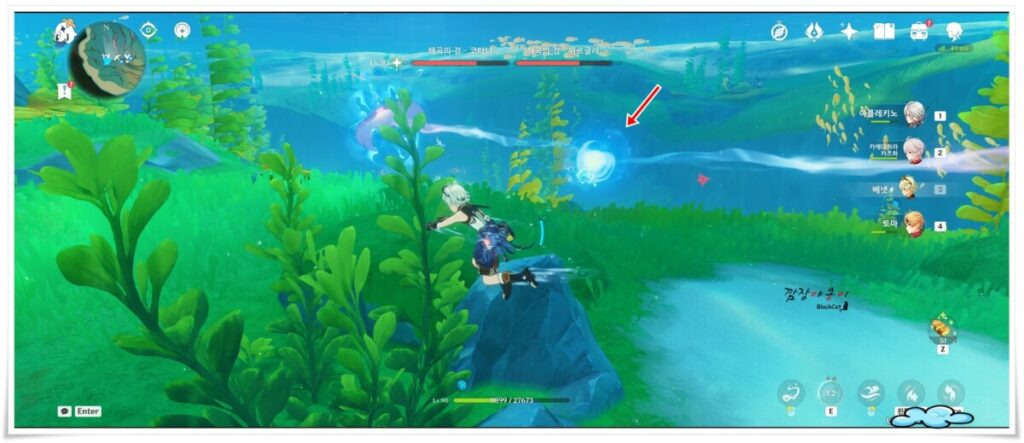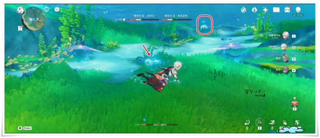 뒤쪽에 가오리의 스킬을 훔쳐와서 네임드 가오리인 '전설의 칼날 가오리'와 전투를 하다보면 화살표 처럼 두마리의 가오리의 중간에 물방울이 생기는 것을 볼 수 있을 텐데요.