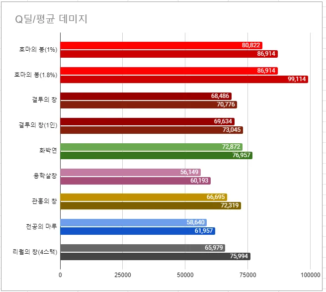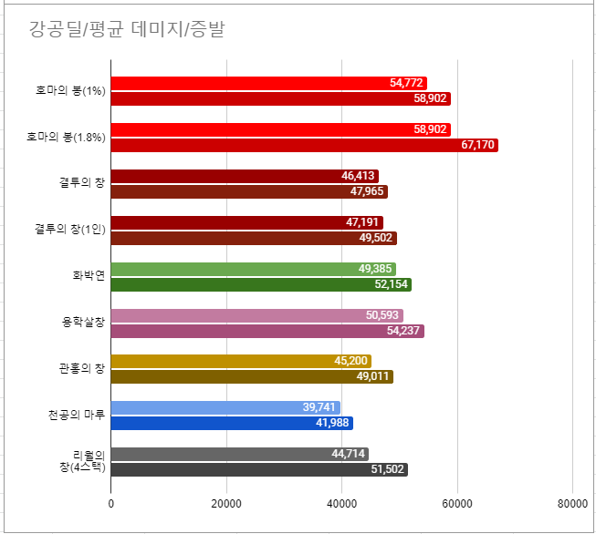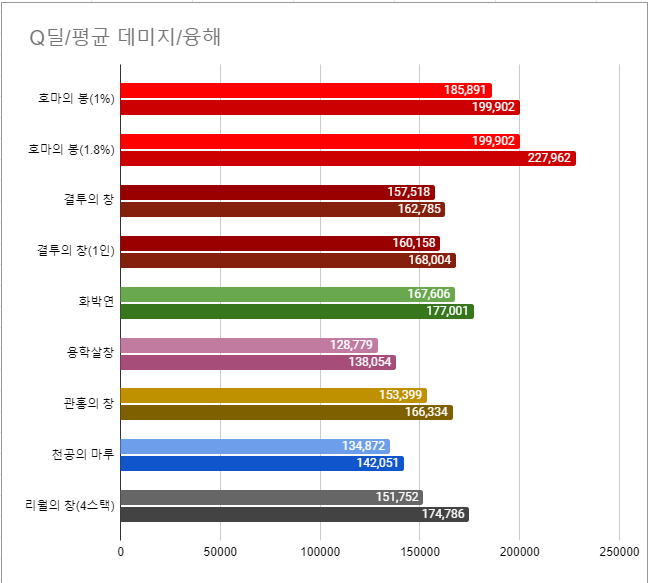 융해와 증발시 데미지 비교인데 확실히 다른 무기에 비해 전무인 '호마의 지팡이'가 월등한 성능을 보여주는 것을 확인 할 수 있습니다.