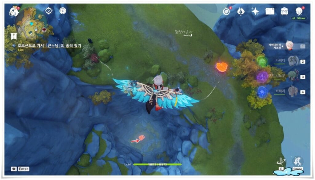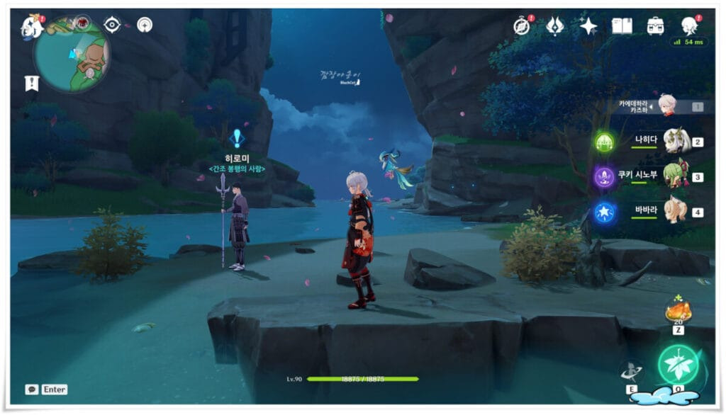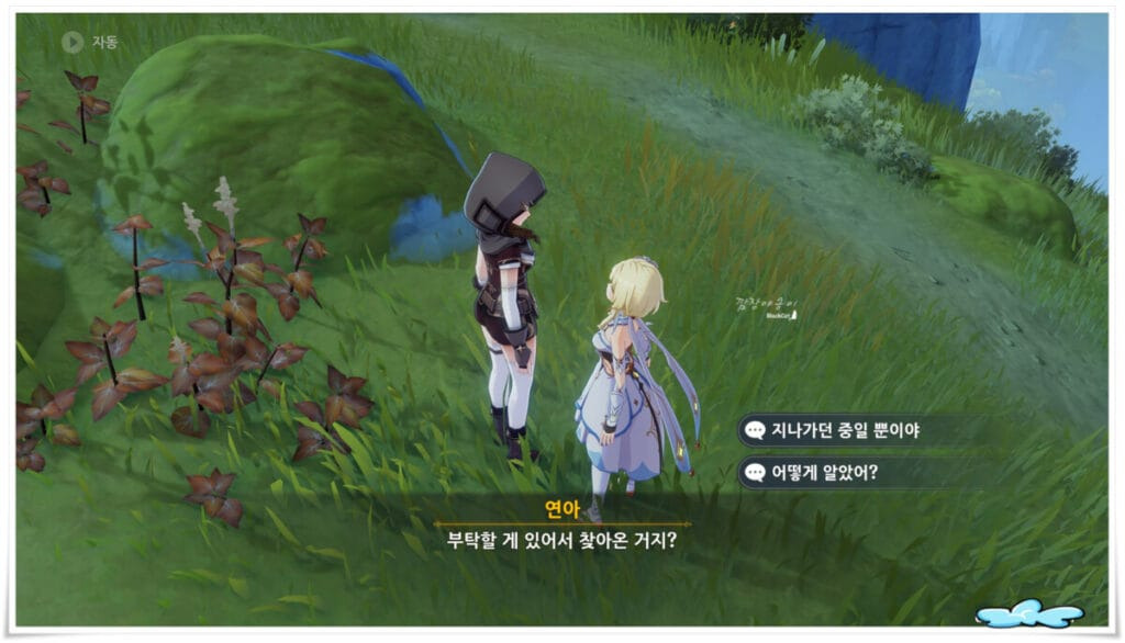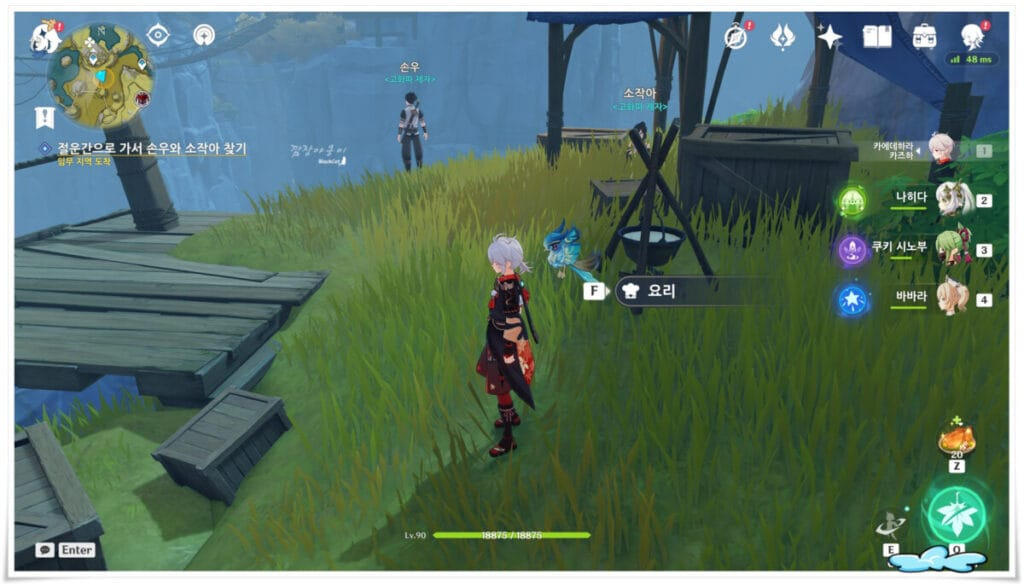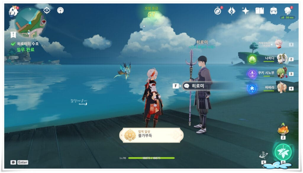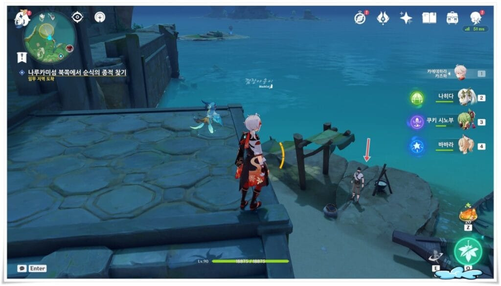 두번째는 이나즈마 나루카미섬의 황해 우측에 있는 해안으로 가시면 NPC순식이 있습니다. 딱히 대화를 걸지 않아도 근처에 도달하시면 자동으로 연계 퀘스트가 진행됩니다.