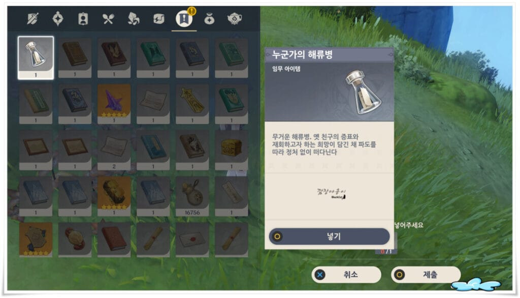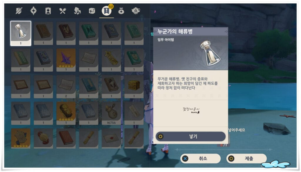 첫번째는 미리 구해둔 '누군가의 해류병'을 NPC히로미에게 전달하면 됩니다. 선행퀘를 하신 분이라면 자동으로 인벤토리에 '누군가의 해류병'이 있을테니 따로 구하지 않으셔도 됩니다.
