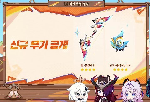신규 무기 활 차스카 전무인 '붉은 깃 별독수리', 4성 무기 '꽃장식 깃'과 법구 4성무기 '돌아오는 파도' 그라고 이벤트를 통해 얻을 수 있는 한손검 '에슈의 재앙' 이 공개되었습니다.
